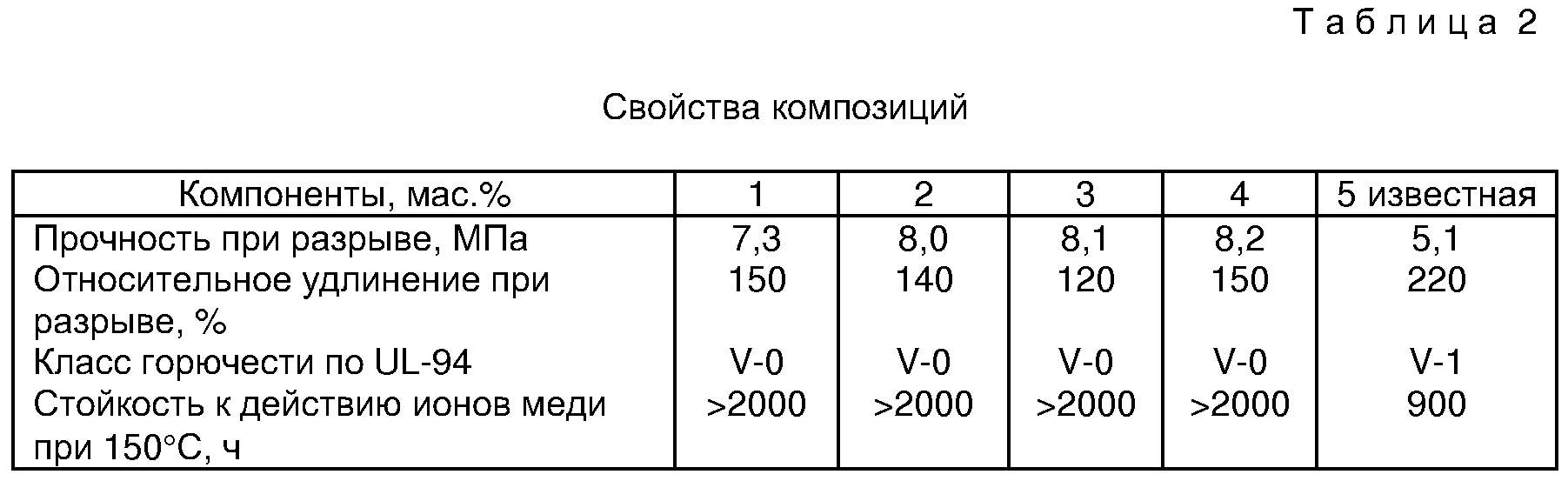 Композиции испытывают на горючесть по стандарту UL-94, стойкость к действию меди по методике ТУ 2243-052-05766563-98 и определяют их прочность и относительное удлинение при разрыве по ГОСТ 11262. Результаты испытаний приведены в табл. 2.