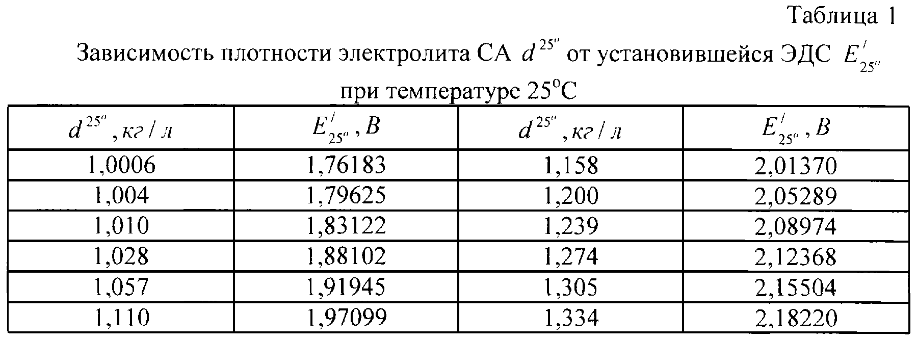По полученному значению установившейся ЭДС СА при 25 С интерполяцией данных табл.1, взятой из [1], определяют плотность электролита, находящегося в порах пластин СА, при 25 С, так как именно плотность электролита в порах пластин и температура электролита определяют ЭДС СА.