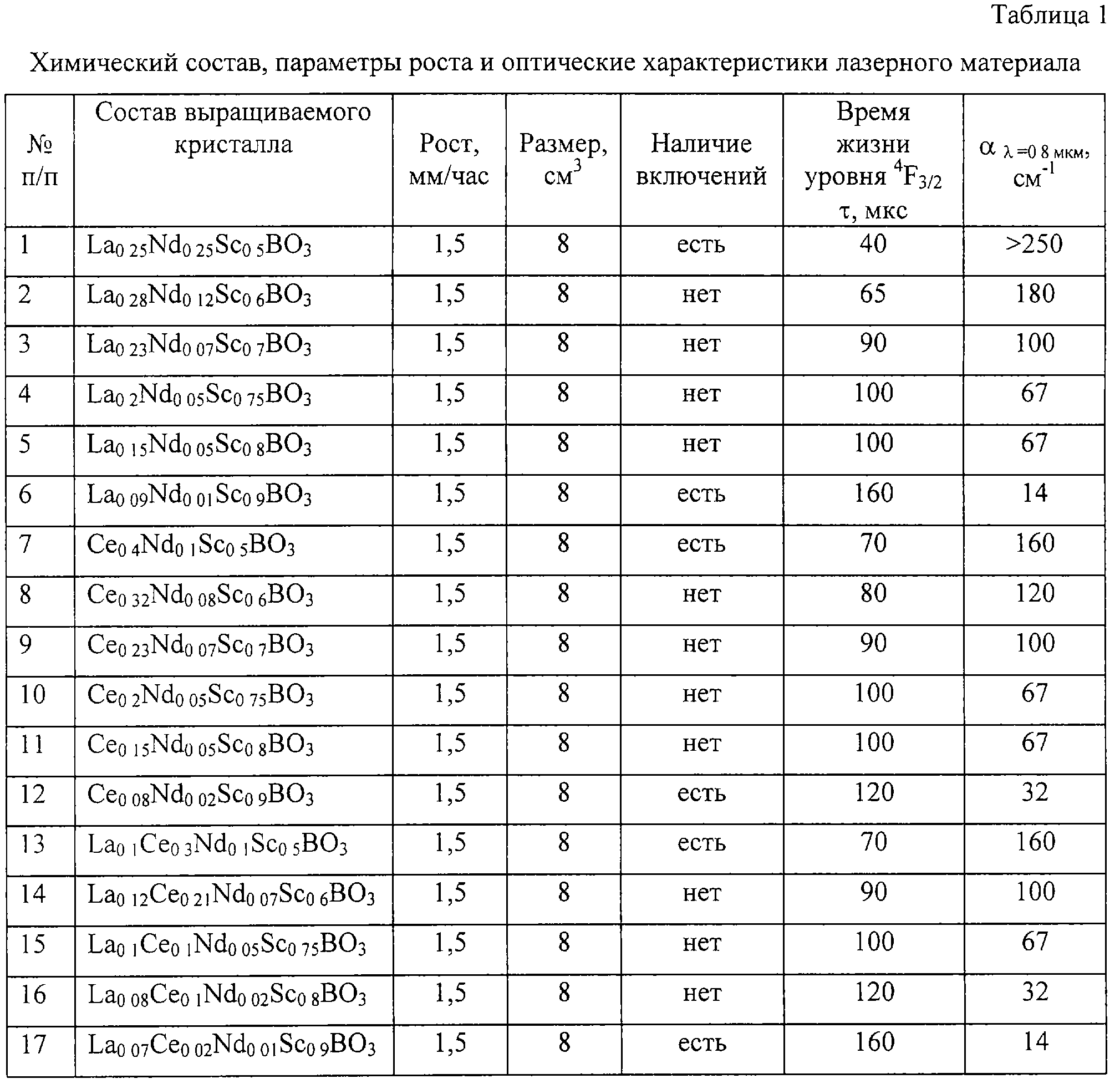 Формула изобретения Лазерный материал на основе ортобората скандия SсВO3, отличающийся тем, что в него дополнительно введены катионы лантана La и/или церия Се и неодима Nd и он имеет химическую формулу R1-x-yNdxSCyBО3, где R-La и/или Се, 0,01<х<0,25, 0,5<у<0,9. РИСУНКИ