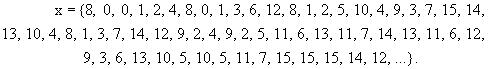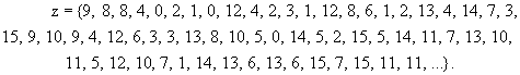 Если двоичные числа будем снимать одновременно с 4, 3, 1, 6 разрядов регистра сдвига (блоки 14, 13, 11, 16) и на каждом такте его работы с набором < 4, 3, 1, 6> будем сопоставлять число в виде z= 4+2 3+22 1+23 6, то последовательность двоичных чисел в процессе работы регистра сдвига можно рассматривать как последовательность чисел z {0, 1, 2, …, 15} в виде