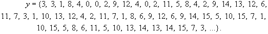 Если двоичные числа будем снимать одновременно с 1, 2, 5, 6 разрядов регистра сдвига (блоки 11, 12, 15, 16) и на каждом такте его работы с набором < 6, 5, 2, 1> будем сопоставлять число в виде y= 6+2 5+22 2+23 1, то последовательность двоичных чисел в процессе работы регистра сдвига можно рассматривать как последовательность чисел y {0, 1, 2, …, 15} в виде