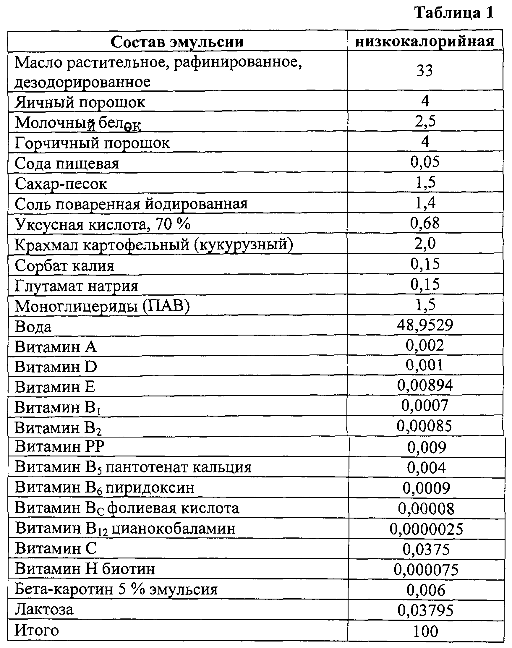 1. Пищевой низкокалорийный эмульсионный продукт, включающий масло растительное, яичный порошок, сахарный песок, горчичный порошок, уксусную кислоту, молочный белок, крахмал, консерванты, витамины, воду, отличающийся тем, что масло используется растительное рафинированное дезодорированное, уксусная кислота 70%, соль поваренная йодированная, а из витаминов используют: А, D, Е, В1, В2, РР, В5, В6, Bс, B12, С, Н, в качестве консерванта – сорбат калия, в качестве усилителя вкуса – глутамат натрия, причем эмульсионный продукт дополнительно содержит 5% эмульсию бета-каротина, лактозу, крахмал картофельный или кукурузный и соду пищевую при следующем соотношении, мас.% (см. табл.1).