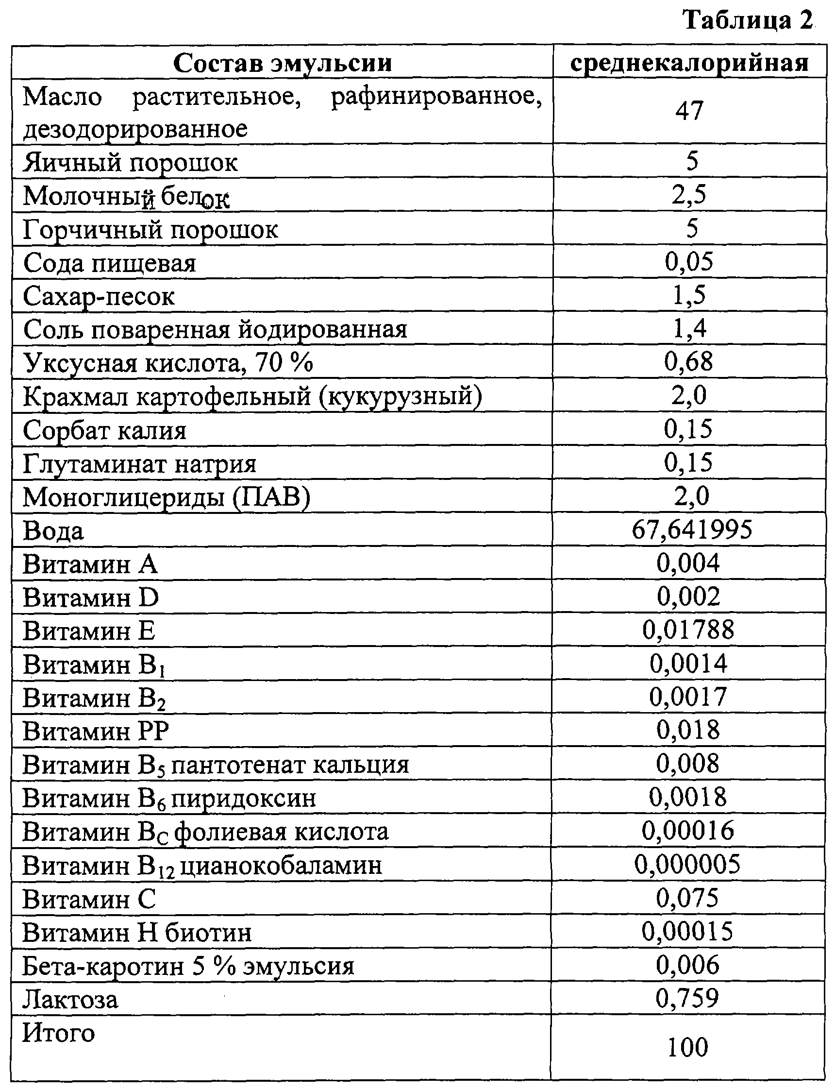 Пищевой среднекалорийный эмульсионный продукт, включающий масло растительное, яичный порошок, сахарный песок, горчичный порошок, поваренную соль, уксусную кислоту, молочный белок, крахмал, консерванты, витамины, воду, отличающийся тем, что масло используется растительное рафинированное дезодорированное, уксусная кислота 70%, соль поваренная йодированная, а из витаминов используют: А, D, Е, B1, В2, РР, В5, В6, В12, Вс, С, Н, а в качестве консерванта – сорбат калия, в качестве усилителя вкуса – глутамат натрия, причем эмульсионный продукт дополнительно содержит 5% эмульсию бета-каротина, лактозу, крахмал картофельный или кукурузный и соду пищевую при следующем соотношении, мас.% (см. табл.2).