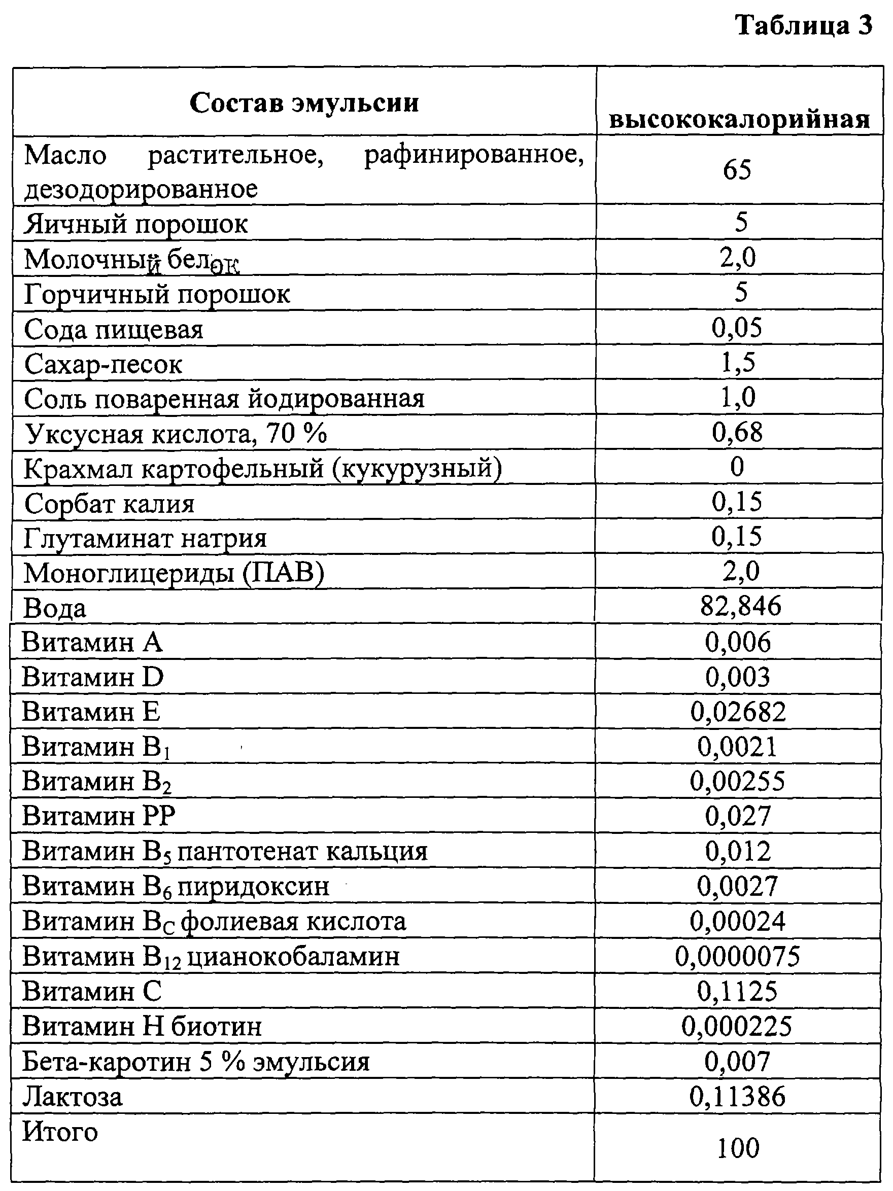 Пищевой высококалорийный эмульсионный продукт, включающий масло растительное, яичный порошок, сахарный песок, горчичный порошок, поваренную соль, уксусную кислоту, молочный белок, крахмал, консерванты, витамины и воду, отличающийся тем, что масло используется растительное рафинированное дезодорированное, уксуная кислота 70%, соль поваренная йодированная, а из витаминов используют: А, D, Е, B1, В2, РР, В5, В6, B12, Bс, С, Н, а в качестве консерванта – сорбат калия, в качестве усилителя вкуса – глутамат натрия, причем эмульсионный продукт дополнительно содержит 5% эмульсию бета-каротина, лактозу, крахмал картофельный или кукурузный и соду пищевую при следующем соотношении, мас.% (см. табл.3).