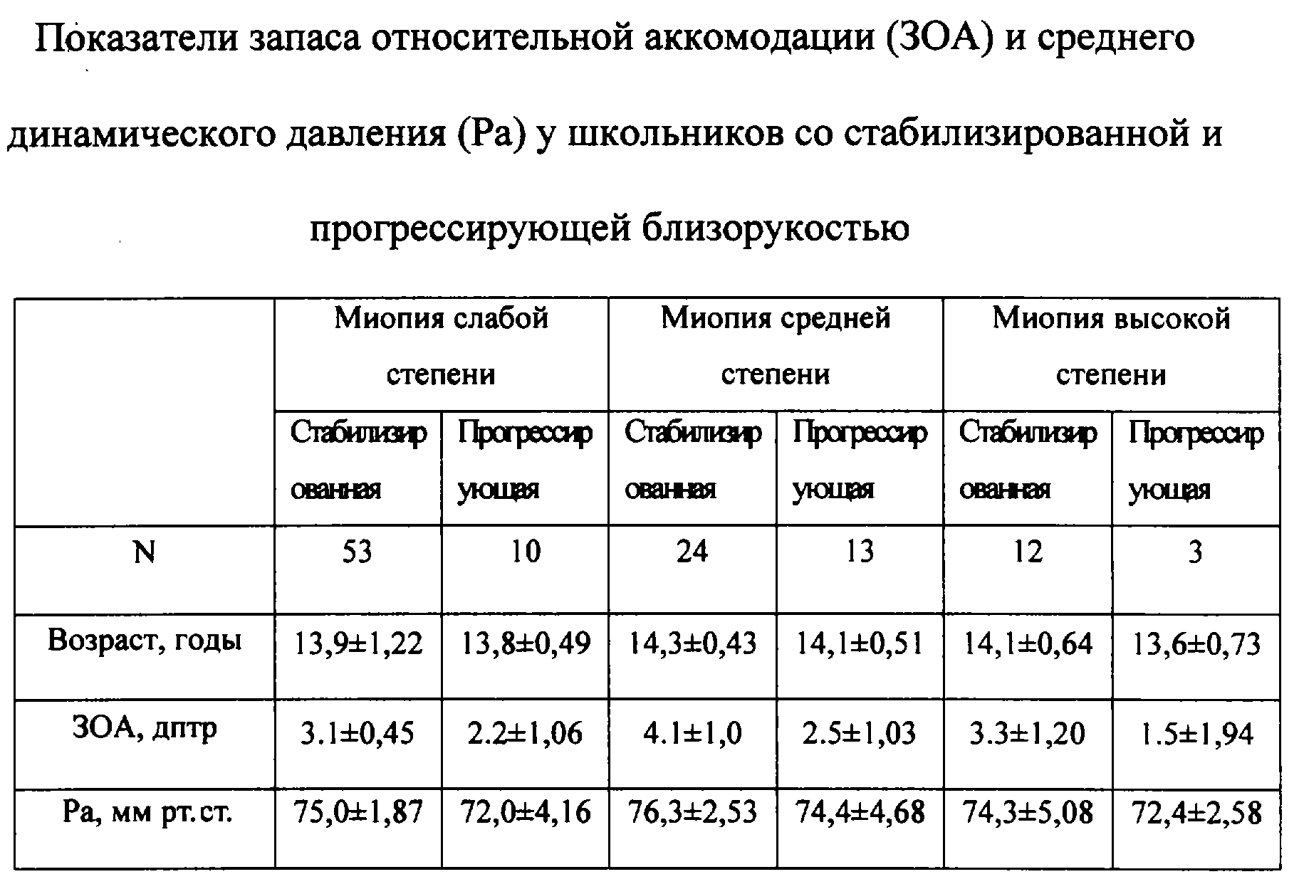 Формула изобретения Способ прогнозирования появления и развития близорукости в среднем и старшем школьном возрасте, отличающийся тем, что производят трехкратное измерение артериального давления на плечевой артерии мембранным измерителем артериального давления с вычислением среднего арифметического показателя и среднего динамического давления (Ра) по формуле Хикэма Ра=Рд+1/3(Рс-Рд), где Pc – систолическое артериальное давление, Рд – диастолическое артериальное давление, и при значении среднего динамического давления меньше 74 мм рт. ст. прогнозируют высокий риск развития близорукости у школьников с эмметропией, а при значении среднего динамического давления больше 75 мм рт. ст. у школьников с миопией предполагают благоприятное течение процесса в динамике. РИСУНКИ