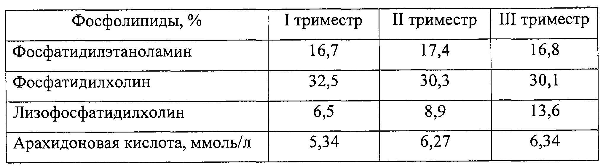 (57) Реферат: Изобретение относится к области медицины, в частности к акушерству. Способ обеспечивает осуществление диагностики на раннем этапе развития воспалительного процесса у беременных с урогенитальным хламидиозом. Проводят изучение метаболических нарушений на уровне липидного обмена, при этом исследуют начальные этапы его нарушения, а именно фосфолипидный спектр и уровень арахидоновой кислоты и при увеличении в периферической крови лизофосфатидилхолина более 4%, снижения фосфатидилэтаноламина менее 22%, фосфатидилхолина менее 36% и увеличении арахидоновой кислоты более 2 ммоль/л у беременных с урогенитальным хламидиозом диагностируют воспалительный процесс. 1 табл. Изобретение относится к медицине, а именно к перинатологии, и может быть использовано для диагностики воспалительного процесса у беременных с урогенитальным хламидиозом. Известен способ диагностики воспалительного процесса при острых и нагноительных процессах внутренних половых органов у женщин путем определения в сыворотке крови концентрации одного из конечных продуктов липидной пероксидации – малонового диальдегида [1]. Известный способ имеет следующие недостатки: 1. Способ основан на определении конечного продукта перекисного окисления липидов. 2. Способ не дает возможности диагностики воспалительного процесса на ранних этапах нарушения липидного обмена. Цель изобретения заключается в ранней диагностике воспалительного процесса у беременных с урогенитальным хламидиозом. Указанная цель достигается определением уровня наиболее значимых фосфолипидов: фосфатидилэтаноламина, фосфатидилхолина и арахидоновой кислоты в периферической крови у беременных с урогенитальным хламидиозом в I, II, III триместрах, а диагностика основана на увеличении процентного содержания лизофосфатидилхолина и концентрации арахидоновой кислоты и снижения процентного содержания фосфатидилэтаноламина и фосфатидилхолина. Способ осуществляется следующим образом. 1. У беременных с урогенитальным хламидиозом в анамнезе или с впервые выявленным, во время настоящей беременности, в периферической крови в I, II, III триместрах определяют уровень следующих фосфолипидов (в %): фосфатидилэтаноламина, фосфатидилхолина, лизофосфатидилхолина; арахидоновой кислоты в ммоль/л. 2. Диагностика воспалительного процесса осуществляется на основании увеличения процентной концентрации лизофосфатидилхолина более 4%, снижения концентрации фосфатидилэтаноламина менее 22%, фосфатидилхолина менее 36%, с одновременным увеличением уровня арахидоновой кислоты более 4 ммоль/л. Примеры выполнения заявленного способа. Пример 1. Беременная С., 23 года, с диагнозом: Беременность 26 недель. Урогенитальный хламидиоз. Данные исследования фосфолипидов периферической крови: уровень фосфатидилэтаноламина 18,4%, фосфатидилхолина 30,5%, лизофосфатидилхолина 12,6%; концентрация арахидоновой кислоты в плазме крови 5,2 ммоль/л. После родов при морфологическом исследовании плаценты выявлены признаки воспалительных изменений в виде очагов лейкоцитарной инфильтрации, эндоваскулита крупных сосудов хориальной пластинки и пупочного канатика, диффузного виллузита. Ребенок родился с признаками врожденной инфекции: везикулеза кожи. В послеродовом периоде у женщины были явления эндометрита. Пример 2. Беременная Н., 