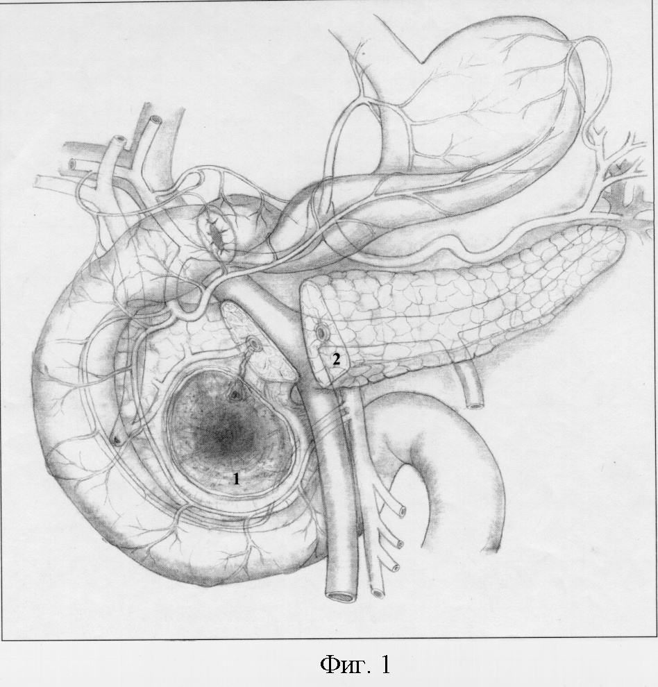 к фронтальной плоскости. К краям раны, во избежание их подсыхания в течение длительной операции, подшивают влажные марлевые салфетки. Далее производят мобилизацию органов гастропанкреатодуоденальной зоны: отделяют большой сальник от поперечной ободочной кишки на всем протяжении – от печеночного угла до селезеночного изгиба. В ряде случаев полость малого сальника бывает запаяна на всем протяжении воспалительно-спаечным процессом, при этом тупо и остро отделяют переднюю поверхность поджелудочной железы от задней стенки желудка. Мобилизуют двенадцатиперстную кишку по Кохеру. Данный этап необходим по нескольким причинам: произведенная мобилизация позволяет пальпаторно оценить состояние головки, дистального отдела холедоха, облегчает дальнейший гемостаз и купирует симптомы дуоденальной непроходимости, если рубцово-воспалительный процесс не поразил слои двенадцатиперстной кишки. Проводят интраоперационное УЗ-исследование, во время которого детализируется расположение кисты, состояние головки и дистальных отделов поджелудочной железы, холедоха, кровеносных сосудов. Резецируют переднюю стенку кисты (фиг.1, поз.1), эвакуируют из кисты содержимое и некротические ткани, производят гемостаз прошиванием кровоточащих сосудов монолитной нитью на монолитной игле. Тампонируют полость кисты свободной прядью большого сальника на сосудистой “ножке” (фиг.2, поз.1), дренируют тонкой двухпросветной трубкой (фиг.2, поз.2). Поджелудочная железа пересекается на уровне перешейка (фиг.1, поз.2). Осуществляют гемостаз по линии сечения точечным прошиванием сосудов тонкой монолитной нитью на монолитной игле. Бужем проверяют проходимость проксимальной и дистальных частей главного панкреатического протока, удаляют обнаруженные конкременты. Проксимальный участок главного панкреатического протока на всем протяжении дренируют тонкой (3 мм диаметром) полихлорвиниловой трубкой с боковыми отверстиями (фиг.2, поз.3).