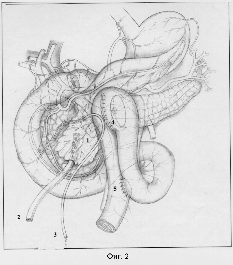 Далее производят реконструктивный этап. На дистальной культе поджелудочной железы формируют концепетлевой панкреатоеюноанастомоз (фиг.2, поз.4) с отключенной по Брауну петлей (фиг.2, поз.3). В послеоперационном периоде дренажные трубки из полости кисты и из главного панкреатического протока удаляют.