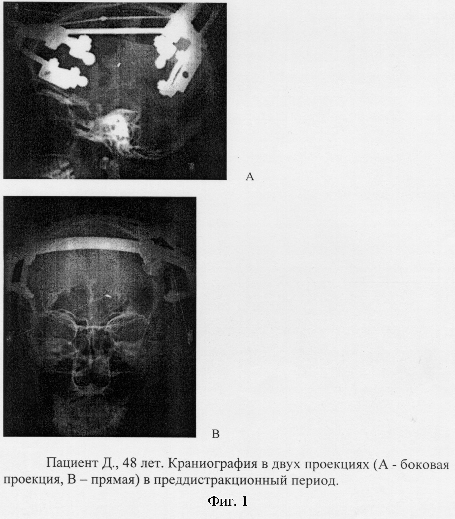 (57) Реферат: Изобретение относится к области медицины, в частности к нейрохирургии, и может быть использовано при лечении больных с ишемическими поражениями головного мозга. Осуществляют костно-пластическую трепанацию черепа в проекции патологического очага мозга. Определяют степень васкуляризации твердой мозговой оболочки по периметру сформированного трепанационного окна. Выделяют костный лоскут, фиксируют его в проекции участка, имеющего максимальные значения объемного капиллярного кровотока. Затем дозированно перемещают его в трепанационном окне в направлении кромки с наименее васкуляризованным участком твердой мозговой оболочки до образования костного регенерата и устойчивых экстра-, интракраниальных анастомозов. Способ позволяет сократить сроки лечения и предупредить осложнения. 4 ил. Изобретение относится к области медицины, в частности к нейрохирургии, и может быть использовано при лечении больных с ишемическими поражениями головного мозга. Известен способ восстановительного хирургического лечения больных с ишемическими поражениями головного мозга (1) путем создания экстра-интракраниальных анастомозов. Однако данный способ технически сложен, травматичен, сопряжен с возможностью развития послеоперационных осложнений и не всегда позволяет в достаточном объеме восстановить уровень кровоснабжения пораженного участка мозга. Известен способ направленной стимуляции кровоснабжения участка головного мозга при его ишемическом поражении (2), предусматривающий выделение костного лоскута и его дозированное перемещение в трепанационном окне, формируемом в проекции пораженного участка мозга, до образования костного регенерата и устойчивых экстра-, интракраниальных анастомозов. Однако при использовании данного способа отмечается вялое течение регенераторного процесса, сопровождающееся, в ряде случаев, частичным лизисом перемещаемого костного лоскута и, как следствие, длительное формирование устойчивой новообразуемой сосудистой сети, что обусловлено слабой васкуляризацией участка, от которого осуществляют перемещение формируемого костного лоскута. В совокупности это увеличивает продолжительность лечения, вызывает необходимость выполнения дополнительных хирургических манипуляций по перемонтажу аппарата, используемого при реализации способа. Задачей изобретения является разработка способа стимуляции кровоснабжения головного мозга при его ишемическом поражении, обеспечивающего сокращение сроков лечения за счет оптимизации течения остео-, ангиогенеза в условиях направленно создаваемого напряжения, а также предупреждения послеоперационных осложнений. Указанная задача решается тем, что в способе стимуляции кровоснабжения головного мозга при его ишемическом поражении, включающем костно-пластическую трепанацию черепа в проекции патологического очага мозга, формирование костного лоскута и его дозированное перемещение в трепанационном окне до образования костного регенерата и устойчивых экстра-, интракраниальных анастомозов, по периметру сформированного трепанационного окна определяют степень васкуляризации твердой мозговой оболочки, выделенный костный лоскут фиксируют в проекции участка, имеющего максимальные значения объемного капиллярного кровотока, и перемещают его в 