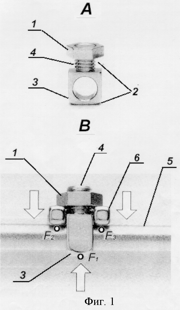(57) Реферат: Изобретение относится к медицинской технике, а именно к устройствам, применяемым для хирургической коррекции и стабилизации позвоночника при его заболеваниях и повреждениях. Изобретение обеспечивает повышение эффективности хирургического лечения и уменьшение риска осложнений за счет упрощения монтажа конструкции, повышения надежности фиксации крюка к стержню. Устройство для фиксации крюка с U-образным проемом к стержню содержит болт с хомутом и фиксирующую гайку на резьбовой части болта. Хомут болта выполнен в виде упругодеформируемой втулки. Наружная поверхность фиксирующей гайки выполнена сферической, а внутренняя – с насечкой. 2 ил. Изобретение относится к медицинской технике, а именно к устройствам, применяемым для хирургической коррекции и стабилизации позвоночника при его заболеваниях и повреждениях. Известно устройство для хирургического лечения заболеваний и повреждений позвоночника Cotrel Dubosset Instrumentation (CDI) системы “Horizon”, в которой для фиксации крюка используется принцип двухточечный фиксации устройством в виде болта с отламывающейся головкой (Рекламный буклет, C.D.HORIZON Deformities Correction System, Система для коррекции деформаций позвоночника “Инфомедиа, Лтд” – 103287, Москва, Петровско-Разумовский пр., 29, 21 с). Данное устройство фиксации крюков к стержням не обеспечивает достаточной надежности (жесткости и продолжительности) фиксации, поскольку: 1) используется двухточечный способ фиксации (прижимной болт сверху стержня и база крюка снизу), 2) при закручивании прижимного болта V-образные выступы на его нижней части не внедряются в стержень на достаточную глубину, как было указано авторами, а следовательно, не увеличивают надежность фиксации. Более того, при закручивании прижимного болта V-образные выступы смещаются в радиальном направлении, бороздя по поверхности стержня, тем самым увеличивая нагрузку на прижимаемый стержень, в связи с чем крутящий момент достигает предельных значений и головка болта обламывается раньше, чем достигается усилие, необходимое для обеспечения надежной фиксации крюка к стержню. Все вышеуказанное является основными причинами разбалтывания крюков под воздействием вибрации с последующей миграцией стержня, разрушением отдельных элементов или всей конструкции. Следствием этого является псевдоартроз, потеря достигнутой коррекции, физиологических изгибов и роста. Наиболее близким к предлагаемой конструкции является модификация CDI система Техасского Скоттиш-Райт Госпиталя (Texas Scottish Rite Hospital, TSRH® Spinal System), в которой используется устройство для трехточечной фиксации крюка с U-образным проемом к стержню, состоящее из болта с хомутом и фиксирующей гайки на резьбовой части болта (Патент США № 5209752, МКИ А 61 В 17/56, 11 мая 1993 г. Lateral offset connector for spinal implant system., авторы Ashman R.B. и Sherman M.C). На фиг.1 изображено устройство для трехточечной фиксации А, используемое в данной конструкции, и механизм его действия В. Устройство состоит из гайки 1, болта 2 с резьбовой частью 4 и головки в виде квадратного хомута 3 со сквозным отверстием. Трехточечный способ фиксации крюка к стержню (место приложения сил указано стрелками) достигается за счет того, что с одной стороны в стержень 5 упирается хомут 3 болта (точка f1), а с противоположной стороны гайка 1, накручиваемая на резьбовую часть 4 болта, прижимает U-образную б