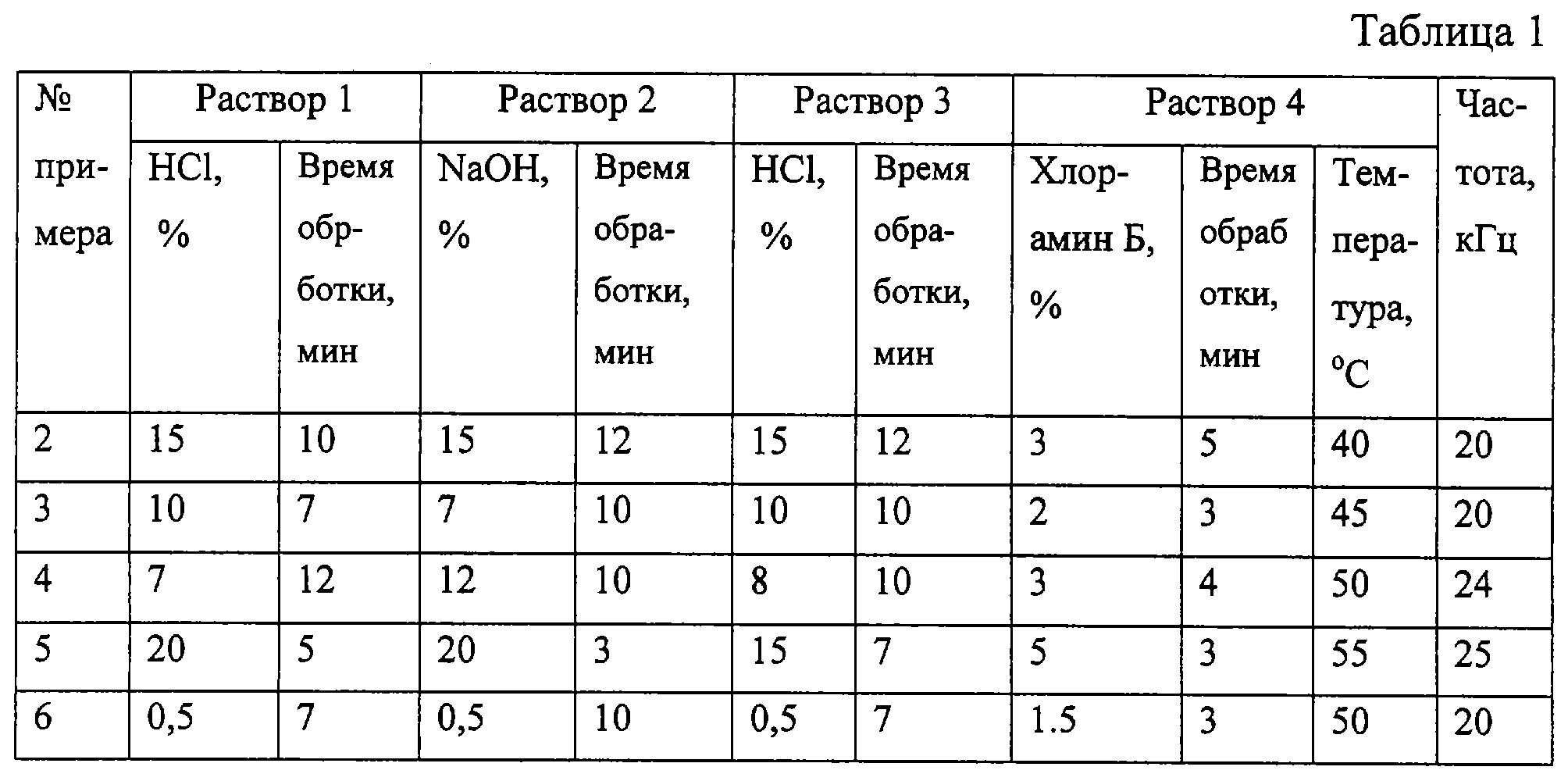 Примеры 2-5 аналогичны примеру 1, отличаются концентрацией растворов. Данные приведены в таблице 1. Частота ультразвуковой обработки во всех растворах одного примера одинаковая.