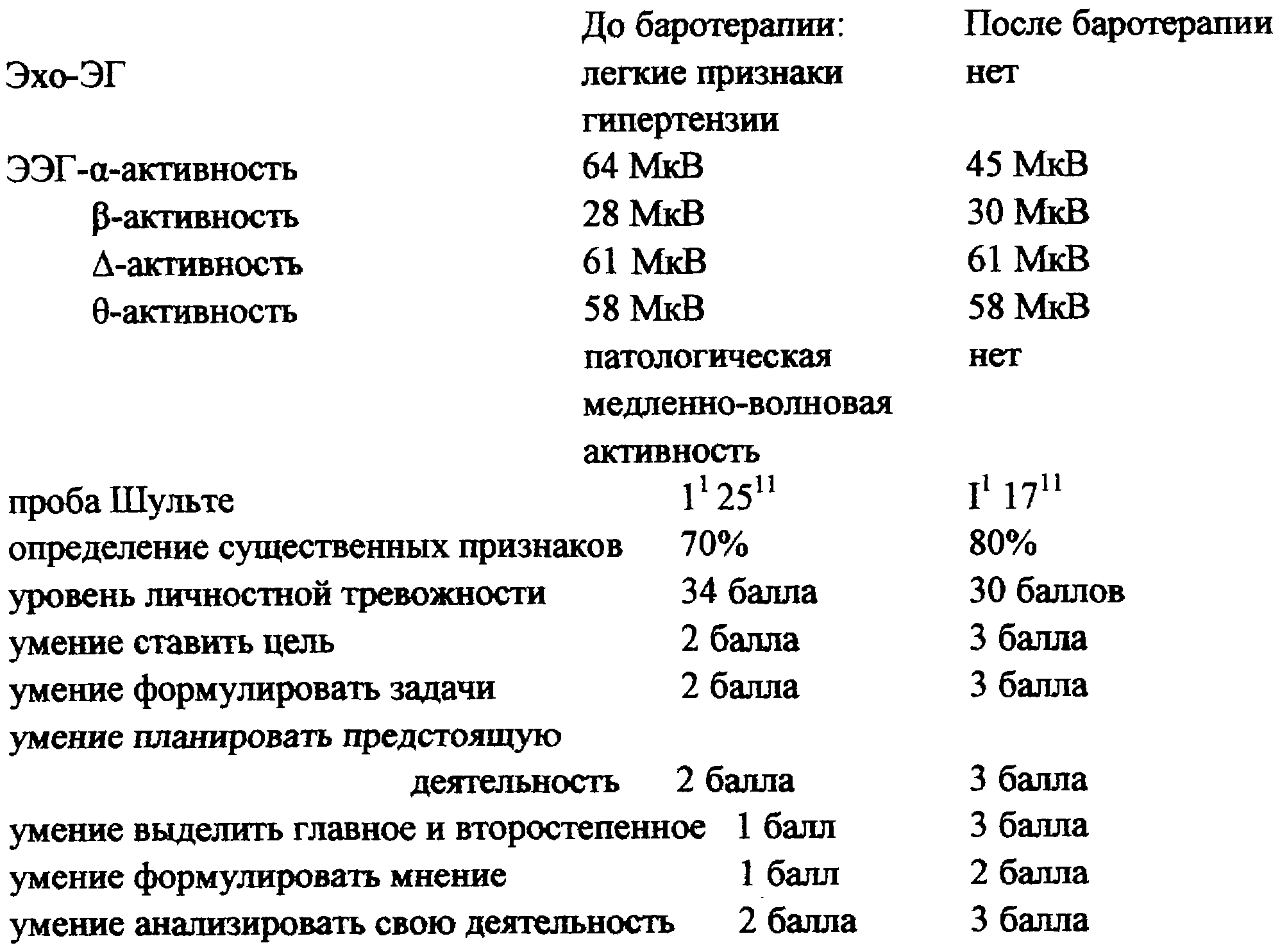 (57) Реферат: Изобретение относится к медицине, к неврологии и может быть использовано для лечения соматической энцефалопатии. Осуществляют физиотерапевтическое воздействие прерывистой гипобарической барокамерной гипоксией в течение 19-24 сеансов с постепенным подъемом больных на высоту с 1000 до 3500 м в течение 7 дней и на уровне 3500 м – до конца курса лечения, при продолжительности пребывания на максимальной высоте в течение 30 минут и общей продолжительности сеанса 1 час. Данное изобретение способствует восстановлению психических и общемозговых расстройств у пациентов данной категории. 1 табл. Изобретение относится к области медицины, а именно к нетрадиционным методам лечения соматической энцефалопатии у детей. Растет количество данных, свидетельствующих об участии нервных механизмов в генезе бронхиальной астмы, взаимной связи аллергического и нервного воспаления (Жаков Я.И., 1998; Рязник И.Б. с соавт., 1997). Причиной изменения бронхиального тонуса считается нарушение равновесия между возбуждающими и ингибирующими системами (Barwes P.J., 1992). Эффекты нейрогенного воспаления, проявляющиеся в процессе заболевания, влияют на его тяжесть и течение. Особенностью детской бронхиальной астмой является наличие диссоциативных нарушений внутри нейро-иммунно-эндокринного комплекса. У 60% детей, больных бронхиальной астмой, имеются изменения ЭЭГ (электроэнцефалограммы), свидетельствующие о вовлечении в патологический процесс стволовых и гипоталамических структур головного мозга, нарушение корково-подкорковых взаимоотношений. Кроме того, приступы бронхиальной астмы в свою очередь способствуют развитию гипоксии и гипоксемии, усугубляющих изменение со стороны нервной системы. Таким образом, вышеперечисленные данные приводят к формированию соматической энцефалопатии у детей с бронхиальной астмой. Хроническое соматическое заболевание влечет за собой нарушение и отставание формирования психических функции и личностных характеристик. В процессе клинической эволюции бронхиальной астмы у многих больных создается порочный круг, в котором тесно переплетаются тяжелые, нередко угрожающие жизни соматические и нервно-психические нарушения. При этом поражение нервно-психической сферы может сопутствовать заболеванию или возникать вторично на фоне прогрессирования бронхиальной астмы. Нервно-психические нарушения и изменения личности усугубляют тяжесть течения данной патологии. На роль психогенных факторов в формировании и рецидивировании бронхиальной астмы обращают внимание практически во всех фундаментальных исследованиях, посвященных этому заболеванию. Психологические изменения личности были обнаружены у 82% детей тяжелой и среднетяжелой бронхиальной астмой, а у 10% были диагностированы нервно-психические заболевания (А.Д. Зисельсон). Исследователи этой проблемы (А.Д. Зисельсон, Д.Н. Исаев, Н.А. Иванова, А.В. Палаян и др.) отмечают, что при бронхиальной астме существенную роль в формировании нарушений познавательной функции, эмоциональной и личностной сферы играет острая, а в еще большей степени хроническая гипоксия. В тех случаях когда поступление кислорода постоянно нарушается, создаются особенно благоприятные условия для возникновения психолого-педагогических нарушений. У детей нарушается память, внимание, ухудшаются проце