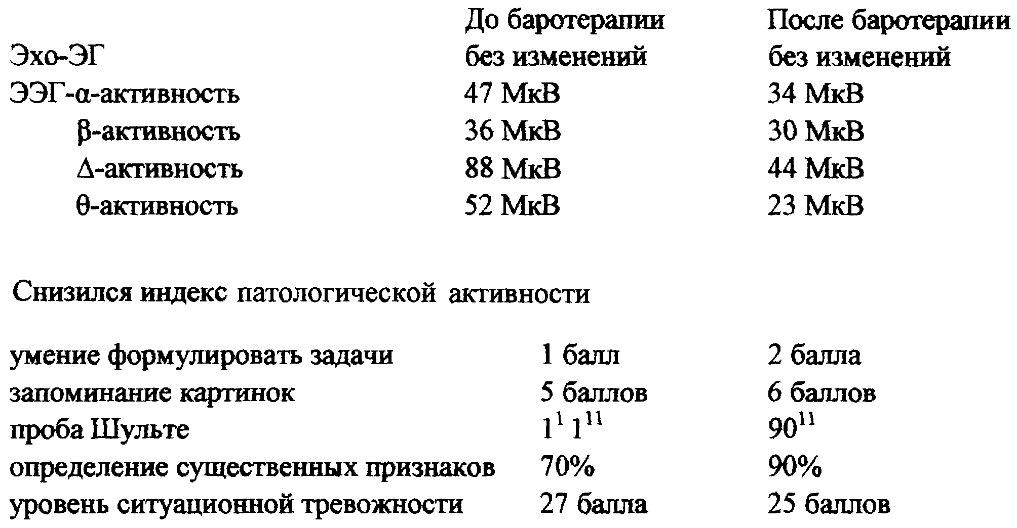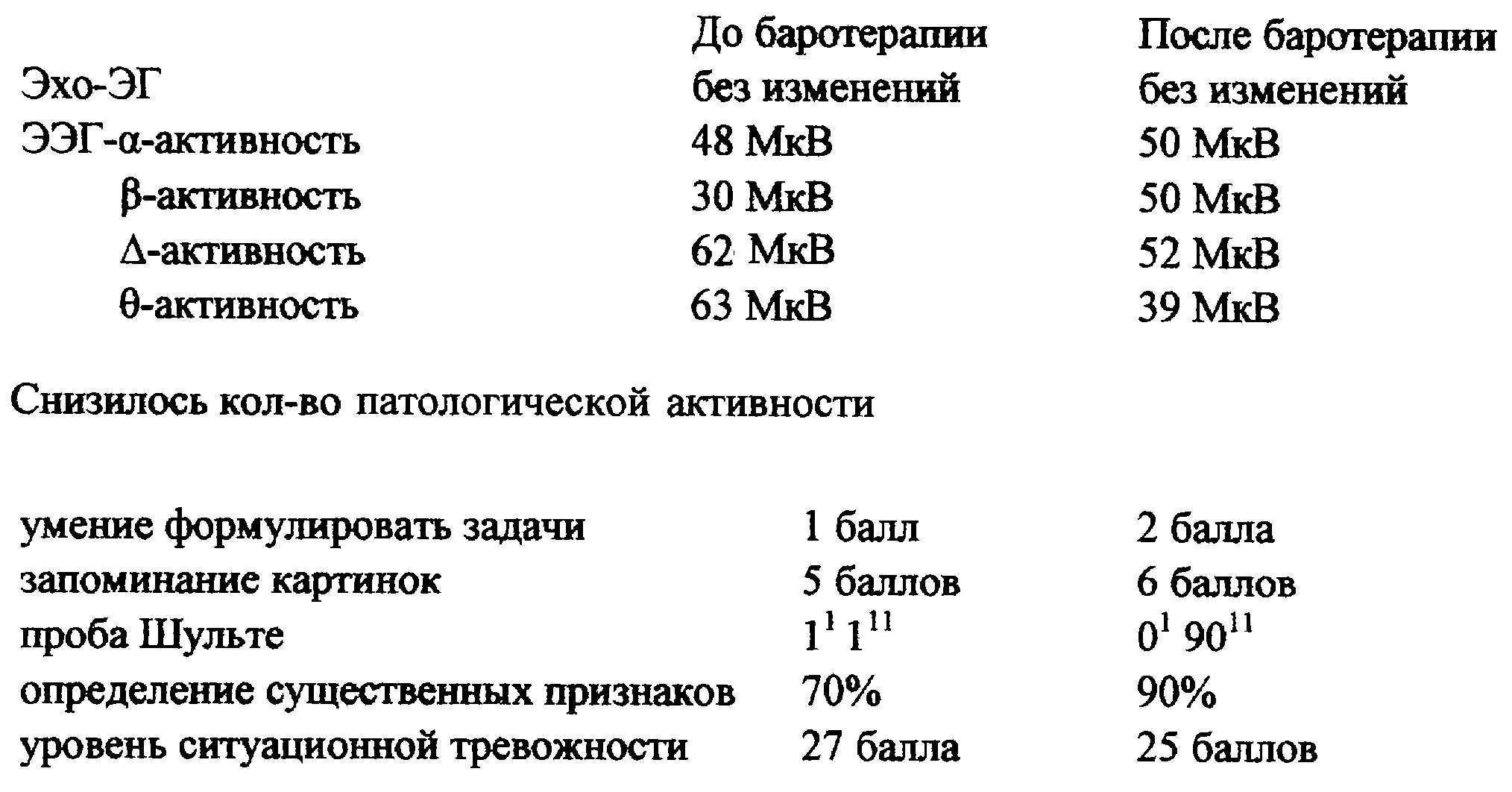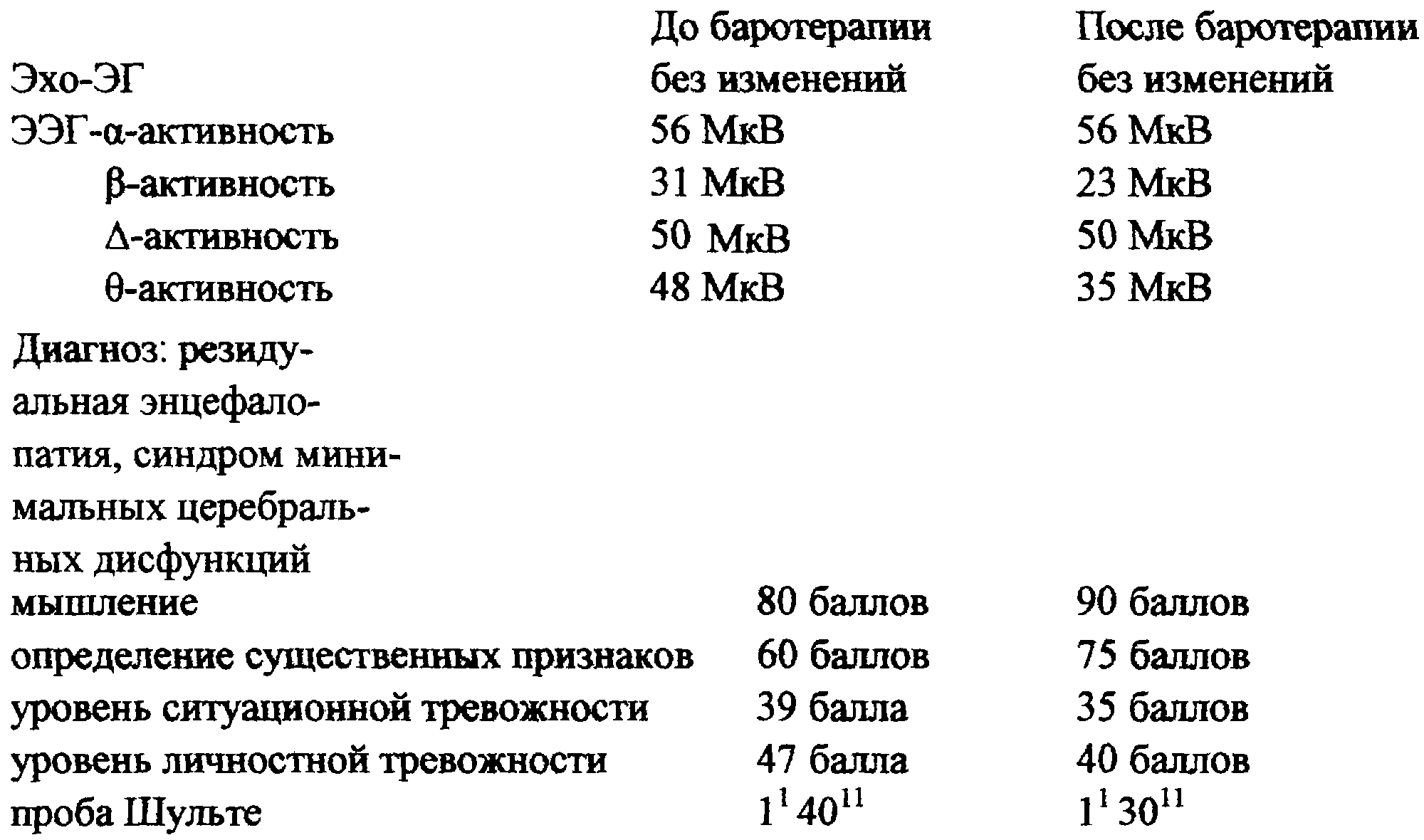 После лечения улучшились запоминание картинок на 1 балл, проба Шульте 11 4011, после лечения 11 3011, корректурная проба улучшилась на 2 балла.