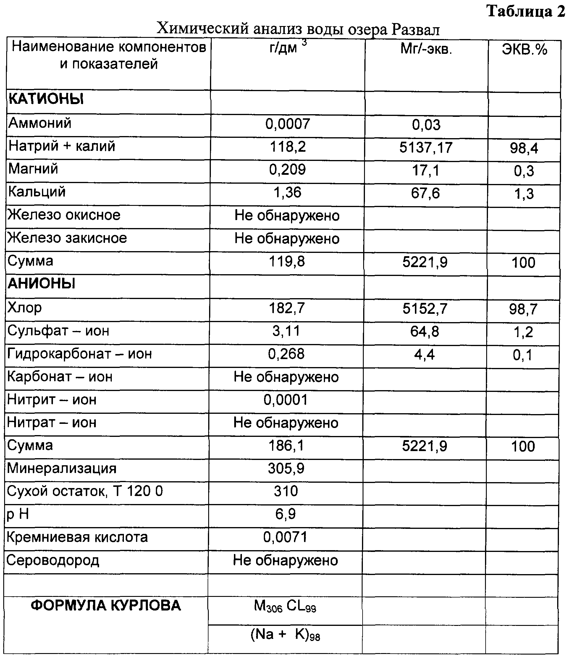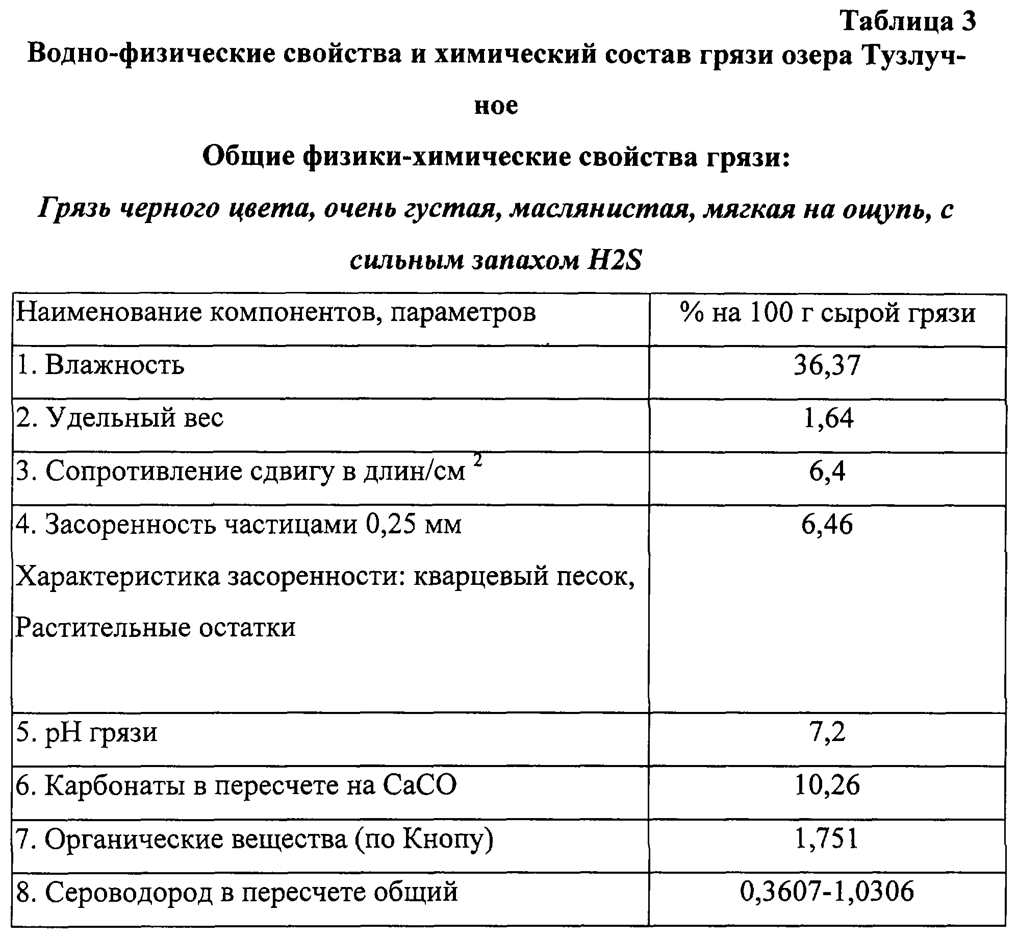 Грязь озера Тузлучное по своему физико-химическому составу является сульфидной иловой. В ее состав входят летучие вещества (сероводород, углекислый газ), аминные основания, ионы неорганических соединений (Na, Cl, К, Са, Mg, Br), биологически активные вещества (таблица 3). Концентрация солей достигает 12%, поэтому озеро относится к грязерапным.