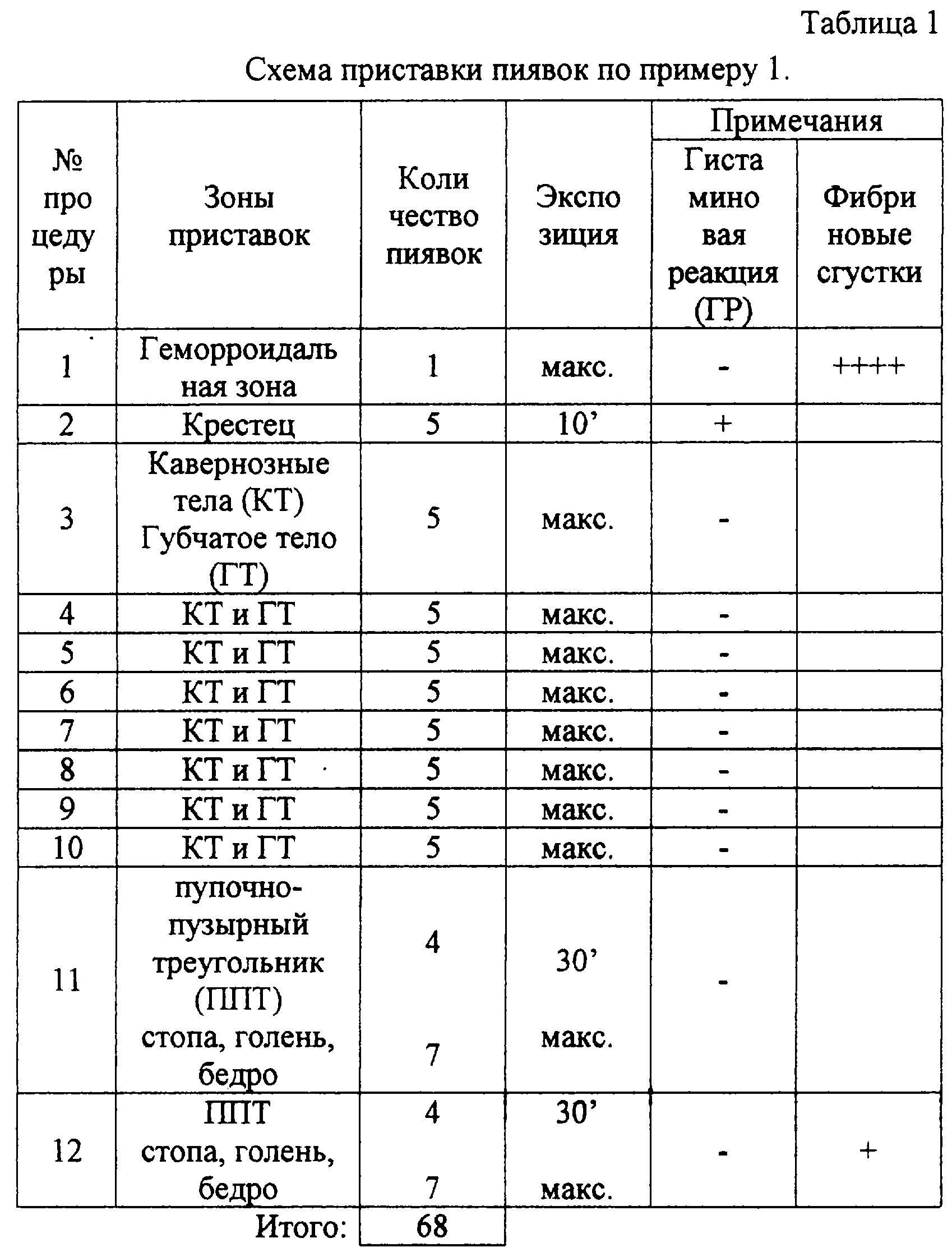 (57) Реферат: Изобретение относится к области медицины, в частности к гирудотерапии. Способ позволяет повысить эффективность гирудотерапии варикозного расширения вен и сократить сроки лечения. Проводят приставки пиявок в шахматном порядке по ходу варикозного расширения вен, а также на точки зоны крестца, надлонной области, печеночной зоны и дополнительно приставки пиявок производят на кавернозные тела в зоне основания больших половых губ и губчатое тело клитора у женщин или на кавернозные тела в зоне прикрепления их к лобковым костям полового члена у мужчин, а также на зону гинекологической промежности, геморроидальную зону и на зону пупочно-пузырного треугольника. 6 табл., 1 ил. Изобретение относится к области медицины, в частности к гирудотерапии, и может использоваться в стационарах и амбулаторно при лечении варикозного расширения вен. Известен способ лечения хронических заболеваний варикозного расширения вен путем приставки пиявок в шахматном порядке по ходу варикозно расширенной вены и также на зоны, находящиеся в проекции крестца, в области над лоном, печеночной зоны, в частности, в правом подреберье и под мечевидным отростком. Количество используемых пиявок составляет от 6 до 10, курс лечения от – 2 до 11 сеансов. При трофических язвах количество пиявок на процедуру от 3 до 8, курс от – 3 до 20 сеансов (Морозов В., Савранский В., СПб, 2001, стр.115). Недостатками способа является то, что в ряде случаев, в частности, при аллергических реакциях на кожные приставки пиявок, этот способ не применим. В случае отсутствия реакции результаты лечения оказываются малоудовлетворительными, т.к. количество сеансов и пиявок не позволяет полностью очистить кровеносные и лимфатические сосуды нижней конечности, поэтому возникают частые рецидивы (собственные данные). По наиболее близкой технической сущности в качестве прототипа нами выбран способ гирудотерапии варикозного расширения вен путем приставки пиявок в шахматном порядке по ходу варикозно расширенной вены и на точки зоны крестца, надлонной области, печеночной зоны (Каменев Ю.А., Каменев О.Ю. Вам поможет пиявка. СПб, 1999, стр. 162). При этом количество пиявок на процедуру от 4 до 8, курс лечения составляет от 9 до 11 процедур. Недостатками прототипа, по собственным данным, являются недостаточно высокая эффективность способа и большая длительность лечения – от 3 до 6 месяцев. Задачей изобретения является повышение эффективности гирудотерапии варикозного расширения вен, а также сокращение сроков лечения. Поставленная задача решается тем, что приставку пиявок осуществляют в шахматном порядке по ходу варикозно расширенной вены, а также на точки зон крестца, печеночной зоны и на кавернозные тела (КТ) в зоне основания больших половых губ и губчатое тело (ГТ) клитора у женщин или на кавернозные тела в зоне прикрепления их к лобковым костям и губчатое тело на нижнюю поверхность корня полового члена у мужчин, а также на зону гинекологической промежности, геморроидальную зону и на зону пупочно-пузырного треугольника (ППТ). Способ осуществляется следующим образом. Пациент перед процедурой принимает душ или ванну нижней половины туловища без применения моющих средств и дезодорантов. Больной лежит на спине с приподнятой головой и согнутыми ногами в положении, как в гинекологическом кресле. Врач поме