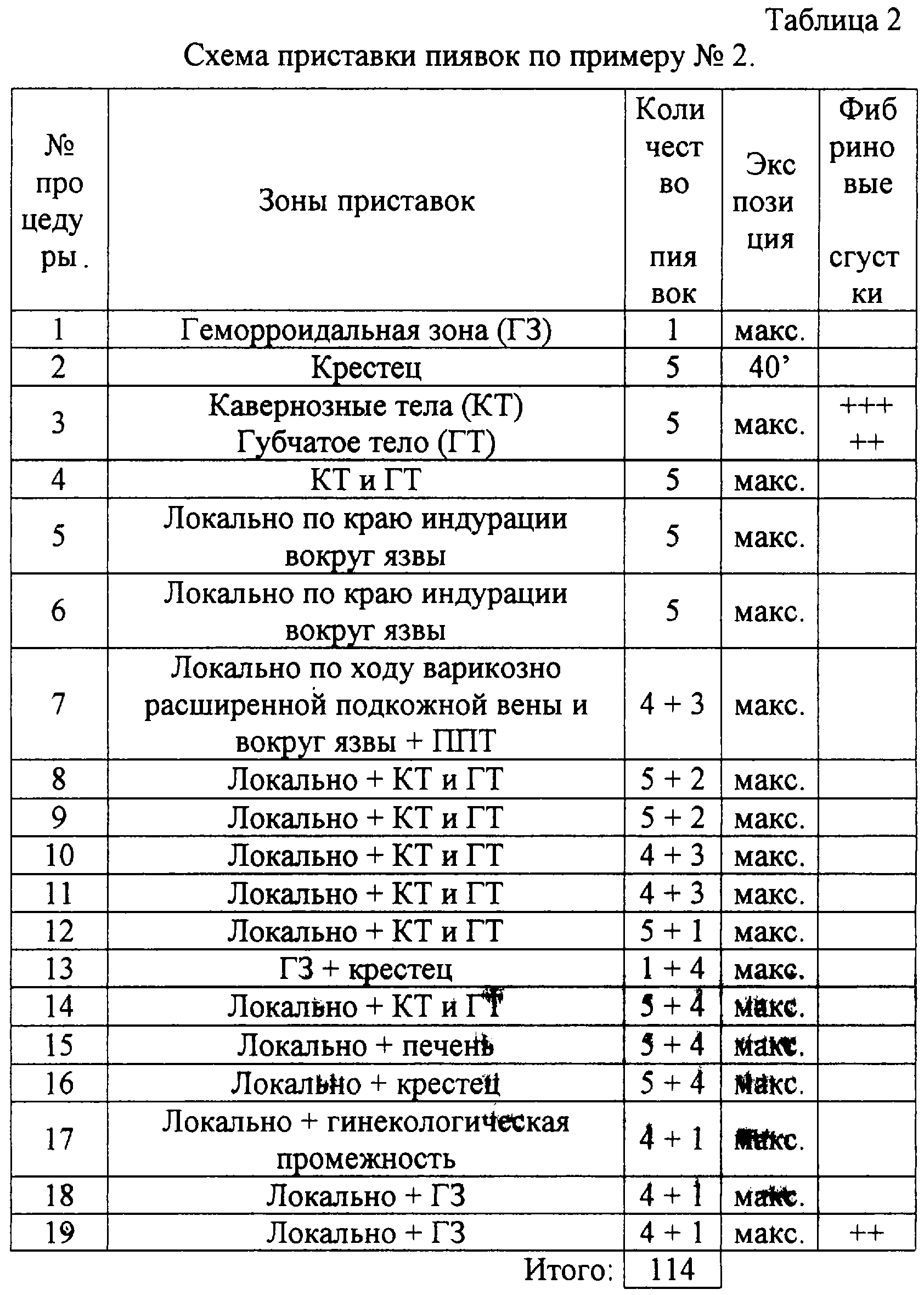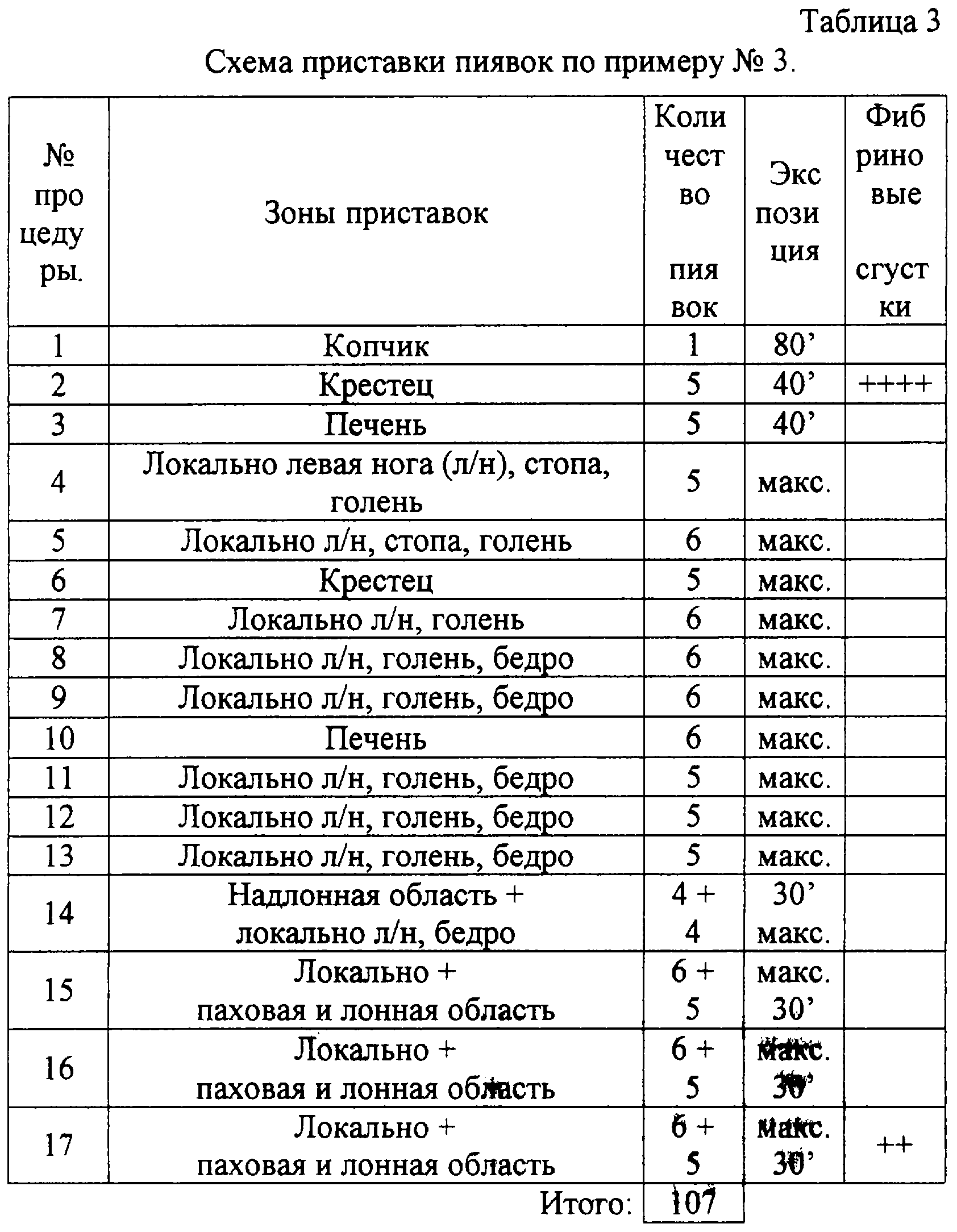 Гирудотерапию проводили по методике прототипа: сочетали приставки пиявок в шахматном порядке по ходу варикозно расширенной вены и точки зон крестца, над лоном и печеночной зоны по схеме (см. табл. 3): 1-й день – 1 пиявка на копчик до полного насыщения (1 час 20 минут); 2-й день – 5 пиявок – зона крестца – экспозиция 40 минут с последующим механическим удалением пиявок. Кровотечение после приставки длилось 8 часов, количество фибриновых сгустков “++++”. 3-й день – на область печени 5 пиявок, экспозиция 40 минут, затем 2 процедуры приставка пиявок на локальные точки левой ноги, соответственно 5 и 6 пиявок; 6-я процедура – на крестцовую область 5 пиявок до полного насыщения (40 минут), далее 3 процедуры по 6 пиявок на ногу – экспозиция до полного насыщения, вновь на печень – 6 пиявок, и затем повторили вновь 3 процедуры по 5 пиявок на ногу, далее 1 процедура: 4 пиявки на низ живота и 4 на бедро. В заключение проставили на 3-х процедурах 11 пиявок по ходу всей большой подкожной вены и на точки под лоном по ходу проекции наружной подвздошной вены. Все процедуры проводили до полного насыщения пиявок (время экспозиции сократилось до 20-30 минут). В ходе гирудотерапии существенное улучшение наступило после 14 процедуры, т.е. по ходу большой и малой подкожных вен болезненность отсутствовала, стенка вен стала эластичной, мешковидные утолщения в положении стоя не определялись. На курс лечения израсходовано 107 пиявок.