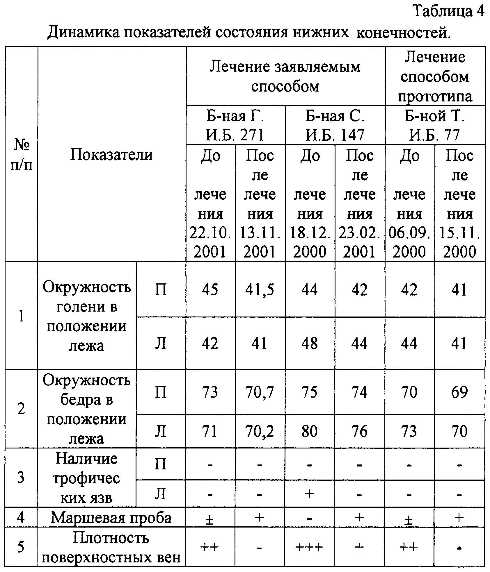 Таким образом, лечение варикозного расширения вен заявленным способом эффективно на IV стадии. Срок лечения – 2 месяца 5 дней. Окружность левой голени, на которой была язва, уменьшилась на 4 см, левого бедра – на 4 см, окружность правой голени уменьшилась на 2 см, правого бедра – на 1 см.