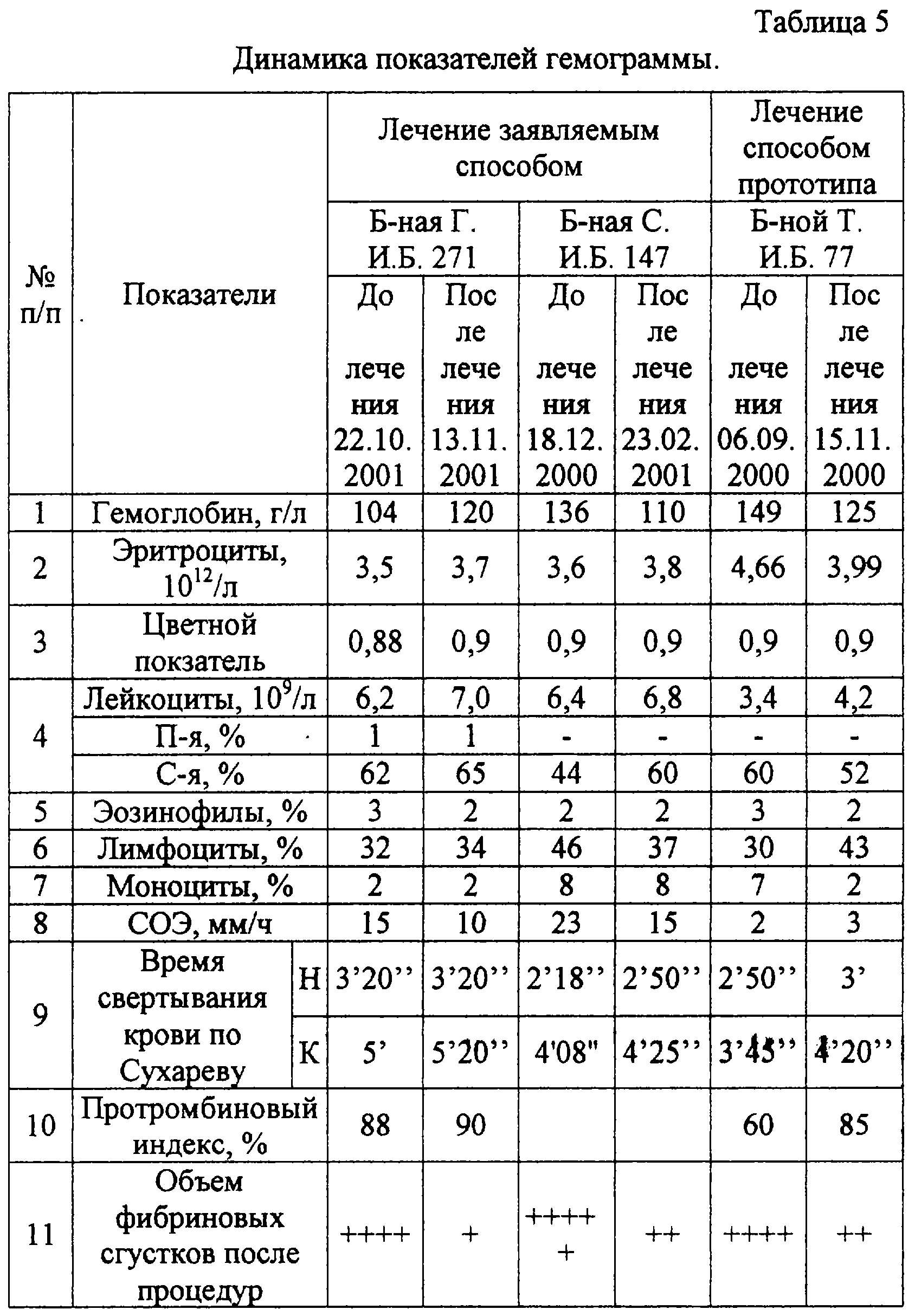 Показатели гемограммы улучшились, однако количество эритроцитов уменьшилось. Время свертывания крови увеличилось с 55’ до 1’20’’. Объем фибриновых сгустков уменьшился лишь до “++”, а в заявленном способе лечения – до “+”, что указывает на недостаточное очищение сосудистого русла от метаболитов.