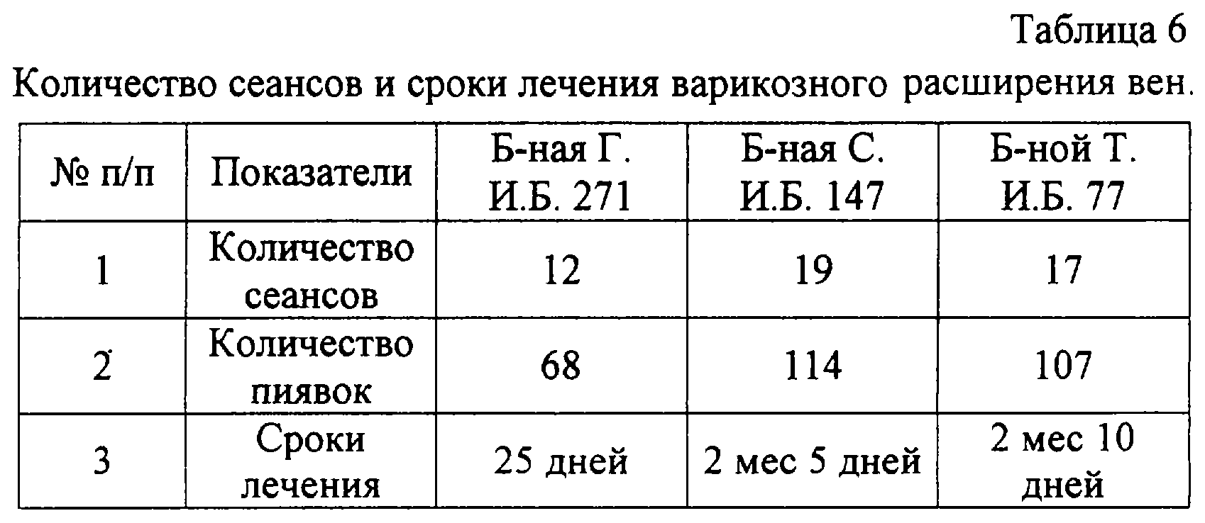 Преимущество заявляемого способа гирудотерапии заключается и в сокращении сроков лечения: для лечения заболевания II стадии заявляемым способом потребовалось 25 дней (12 процедур) и IV стадии – 2 месяца и 5 дней (19 процедур), а по способу прототипа на лечение заболевания II стадии потребовалось 2 месяца и 10 дней (17 процедур) (см. табл. 6 “Количество сеансов и сроки лечения”). Следовательно, заявленный способ лечения позволяет сократить сроки терапии более чем в 2,5 раза.