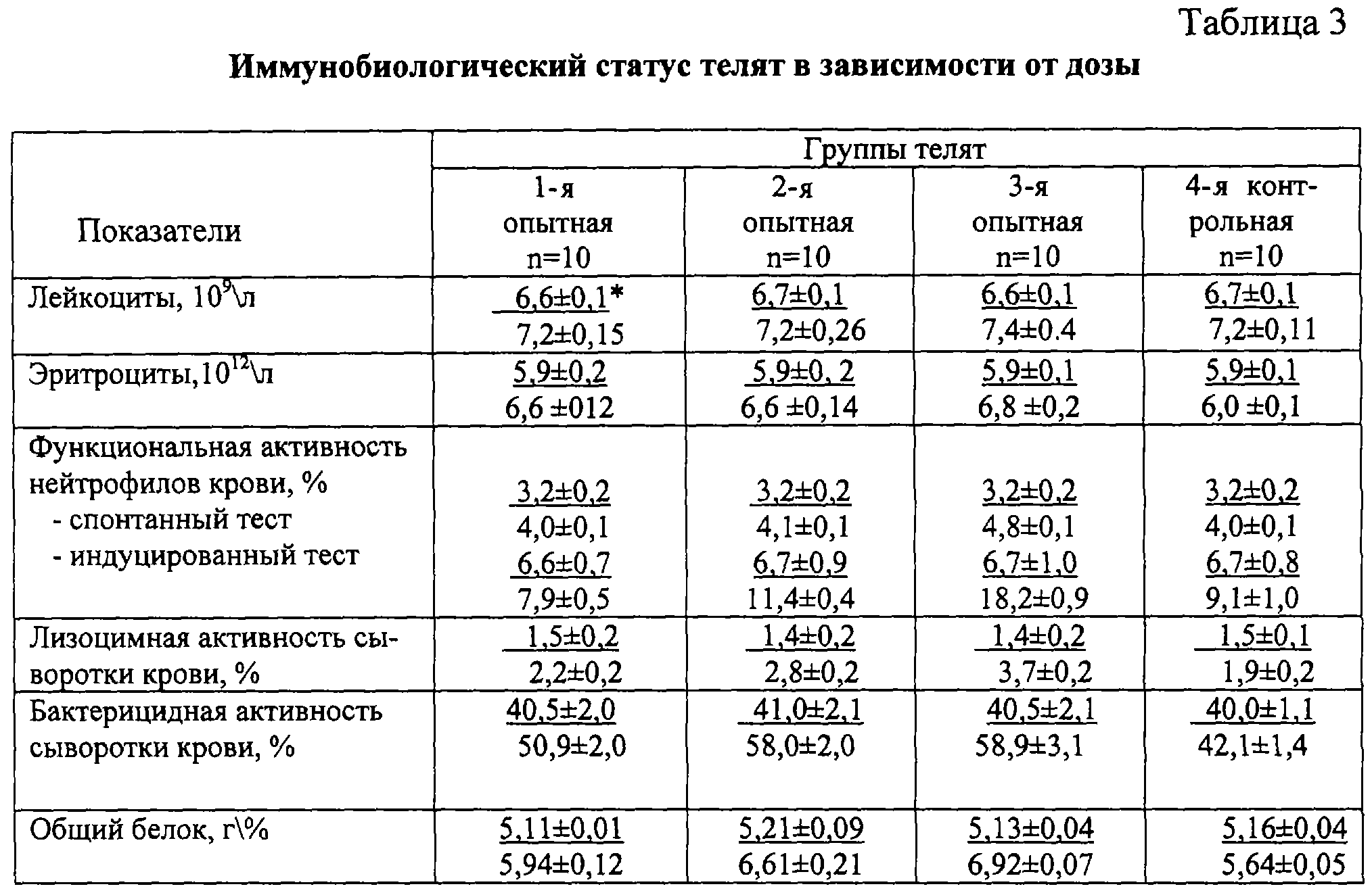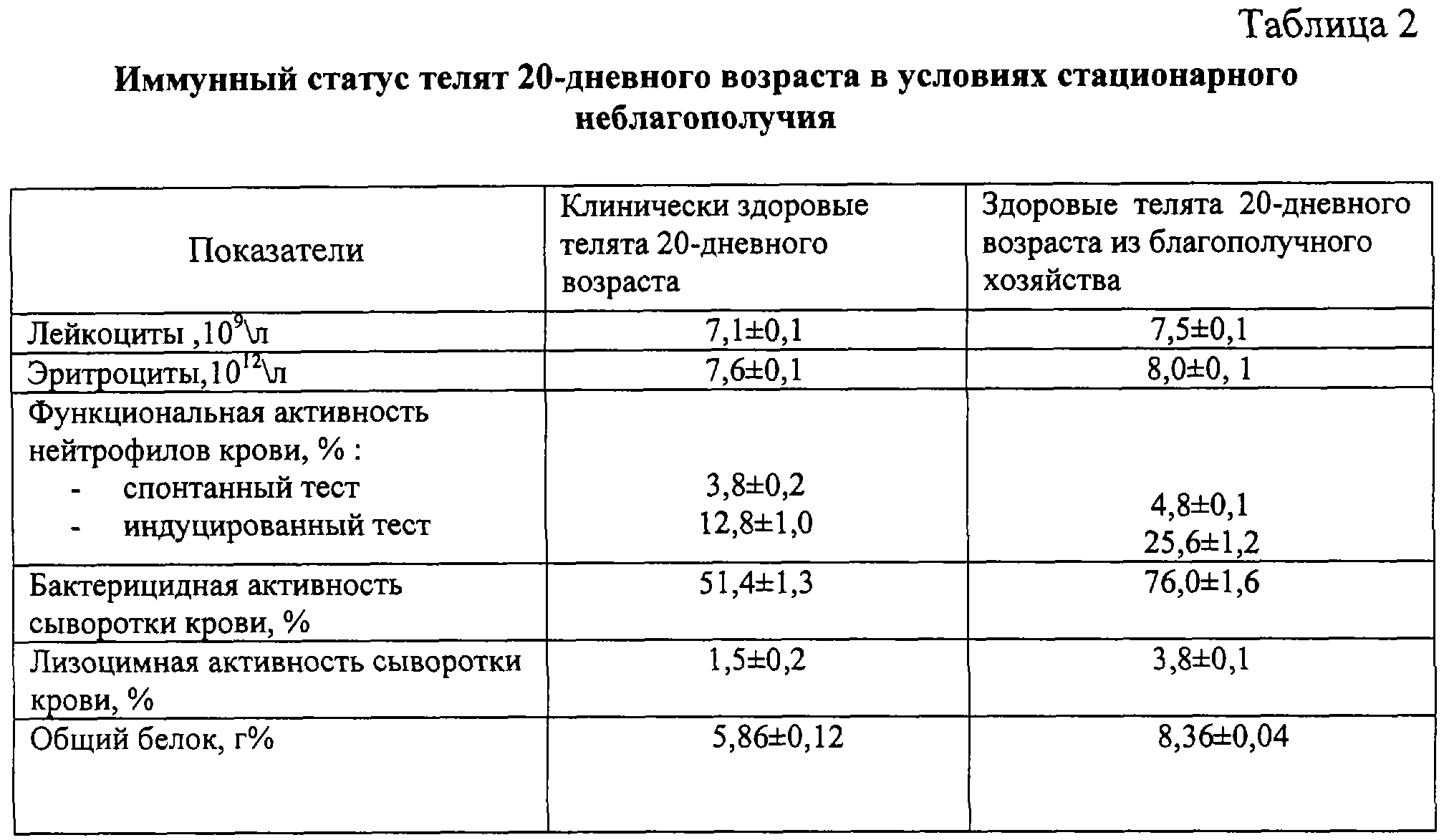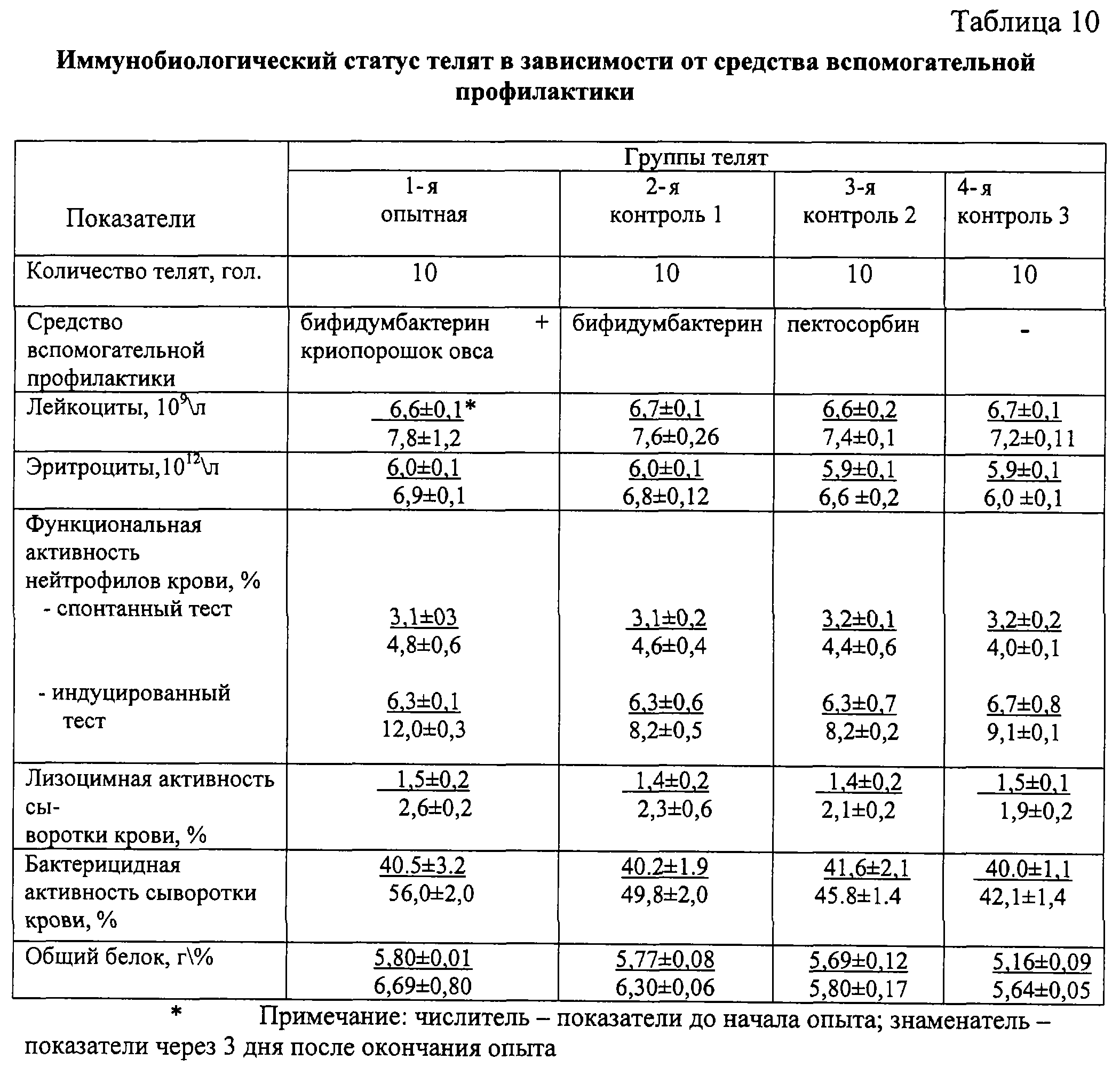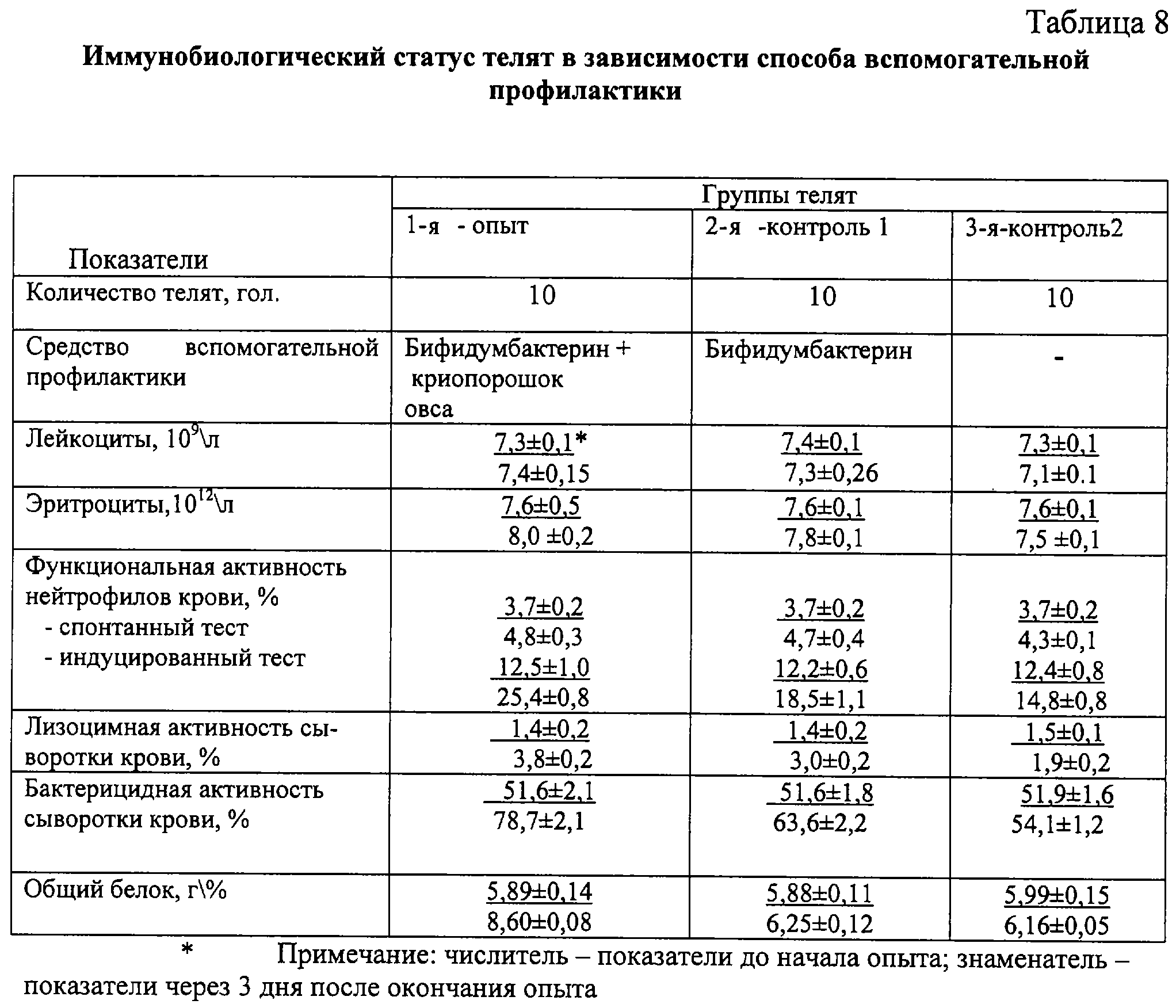 Пример 1. Для определения дозозависимого влияния смеси бифидумбактерина и криопорошка овса на здоровье телят с первых дней жизни и до достижения ими 2-месячного возраста в условиях хозяйства, длительно неблагополучного по желудочно-кишечным заболеваниям телят, формировали 4 группы клинически здоровых телят весом при рождении 25-28 кг. Телят всех групп кормили в соответствии с технологией выращивания 3 раза в сутки из расчета 1,5-2,0 л молока на каждое кормление, причем первый раз материнское молозиво выпаивали не позднее 1,5 часов после рождения; содержали в одинаковых условиях, оптимальных по температуре, влажности и вентиляции. Телятам первых 3 групп за 60 минут до кормления 1 раз в сутки в течение 14 дней, начиная со второй выпойки молозива, применяли внутрь бифидумбактерин в смеси с криопорошком овса в соотношении 1:10 в дозе 8 г, 10 г, 12 г соответственно. Телята 4-й группы служили контролем. Телят взвешивали при рождении, в 1- и 2-месячном возрасте. Ежедневно учитывали клиническое состояние, поедаемость корма. До начала и после окончания опыта у телят брали пробы крови. Для оценки иммунобиологического статуса определяли общий белок, общее количество лейкоцитов, эритроцитов, функциональную активность нейтрофилов крови, лизоцимную и бактерицидную активность сыворотки крови общепринятыми методами. Результаты представлены в таблицах 3, 4, 5.