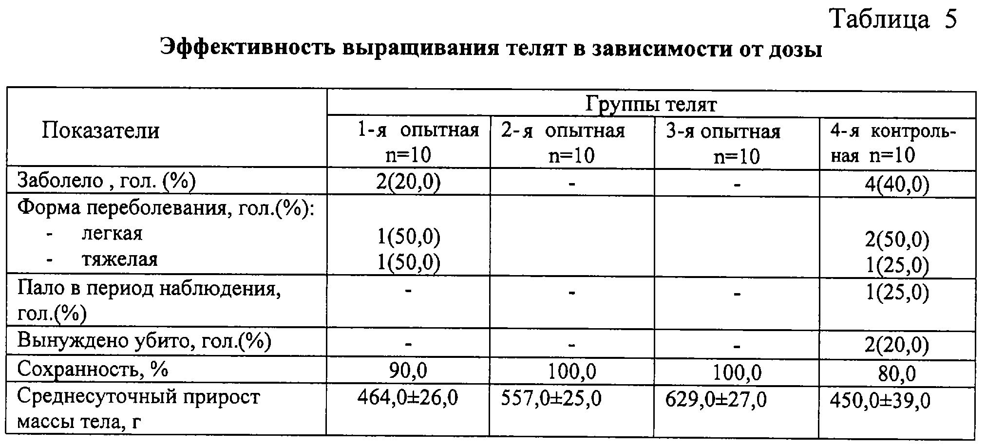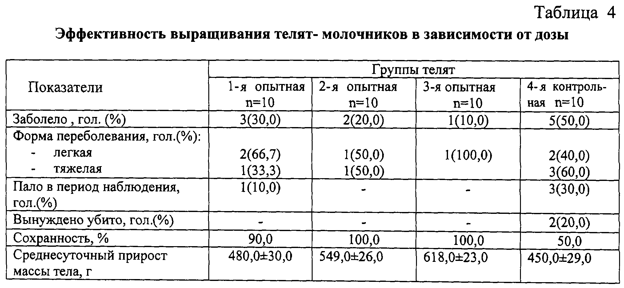 Как видно из таблицы 3, применение бифидумбактерина в смеси с криопорошком овса не оказывало существенного влияния на количество форменных элементов крови. Вместе с тем в крови телят, получавших препараты, существенно возрастал уровень общего белка, повышались показатели естественной резистентности. Установлено, что препараты не оказывали отрицательного влияния на здоровье телят и существенно повышали их резистентность к заболеваниям (таблица 4). Так, в контрольной группе заболело 5 из 10 телят (50,0%), в опытных – 3, 2 и 1 теленок, т.е. 30,0, 20,0 и 10,0%. Профилактическая эффективность составила 70,0, 80,0 и 90,0% соответственно. При этом телята контрольной группы переболевали преимущественно в тяжелой форме, в результате отход составил 50,0%. Сравнение результатов опытных групп подтвердило нецелесообразность применения препаратов в дозах ниже минимальной и выше максимальной, так как эффективность неадекватна затратам.