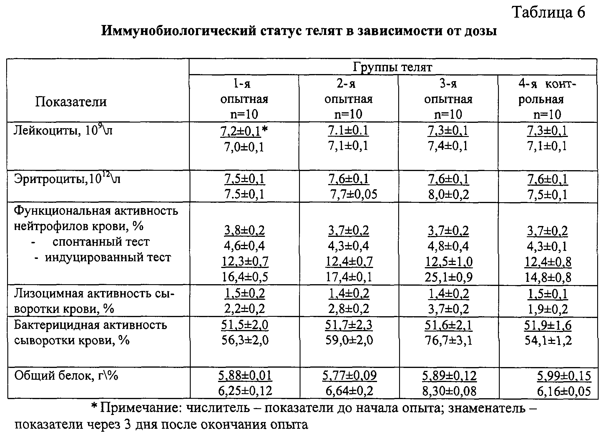 *Примечание: числитель – показатели до начала опыта; знаменатель – показатели через 3 дня после окончания опыта