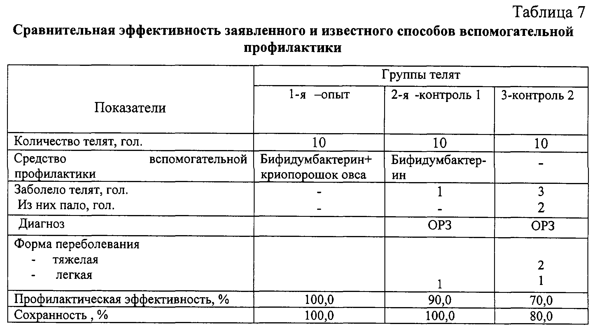 По принципу аналогов формировали 3 группы телят, причем телятам первых двух групп в дополнение к комплексу профилактических мероприятий применяли средства вспомогательной профилактики – в 1-й группе – бифидумбактерин в смеси криопорошоком овса в дозе 12 г на голову в соответствии с изобретением, во 2-й группе – бифидумбактерин в соответствии с рекомендациями по его применению. Курс профилактики составил 14 дней. Период наблюдения – 60 дней. Телят взвешивали при рождении, через 1 месяц и в конце периода наблюдения. Ежедневно учитывали клиническое состояние, обращая внимание на количество заболевших животных, течение и исход болезни. Иммунобиологический статус определяли до начала и после окончания опыта, как в примере 1. Результаты представлены в таблицах 7 и 8.
