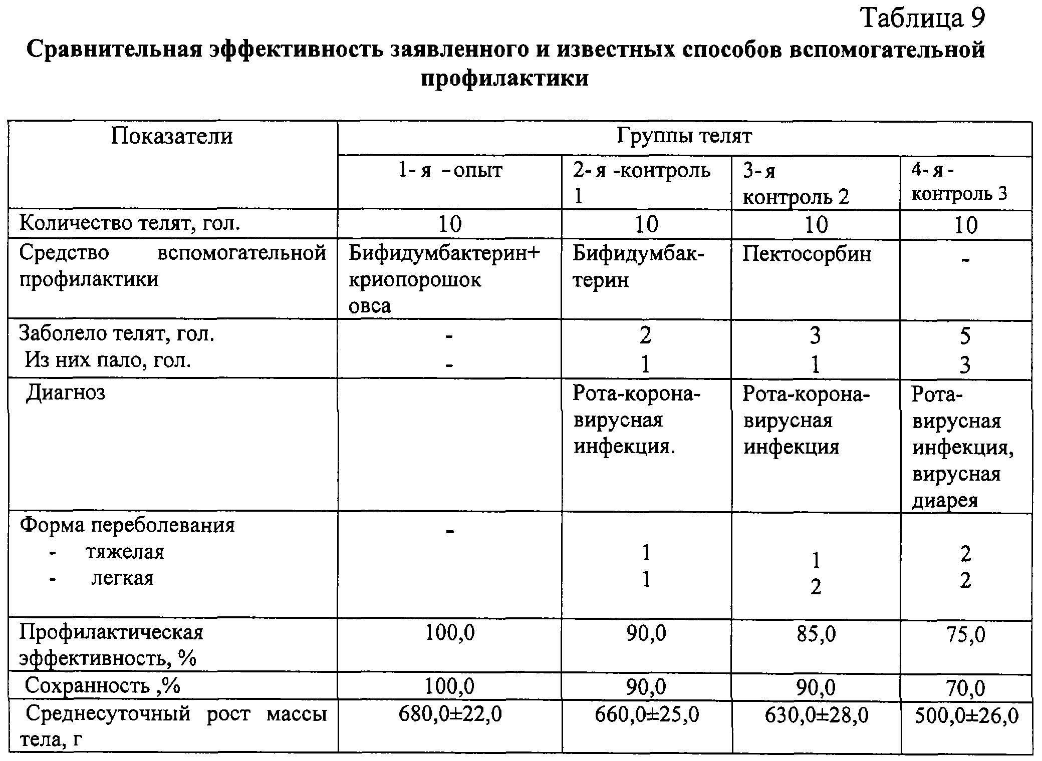 По принципу аналогов формировали 4 группы телят, причем телятам первых трех групп в дополнение к комплексу профилактических мероприятий применяли средства вспомогательной профилактики – в 1-й группе – бифидумбактерин в смеси с криопорошоком овса в дозе 12 г на голову в соответствии с изобретением, во 2-й группе – бифидумбактерин в соответствии с рекомендациями по его применению, в 3-й группе – пектосорбин в соответствии с наставлением по его применению. Курс профилактики составил 14 дней. Период наблюдения – 60 дней. Телят взвешивали при рождении, через 1 месяц и в конце периода наблюдения. Ежедневно учитывали клиническое состояние, обращая внимание на количество заболевших животных, течение и исход болезни. Иммунобиологический статус определяли до начала и после окончания опыта, как в примере 1. Результаты представлены в таблицах 9 и 10.