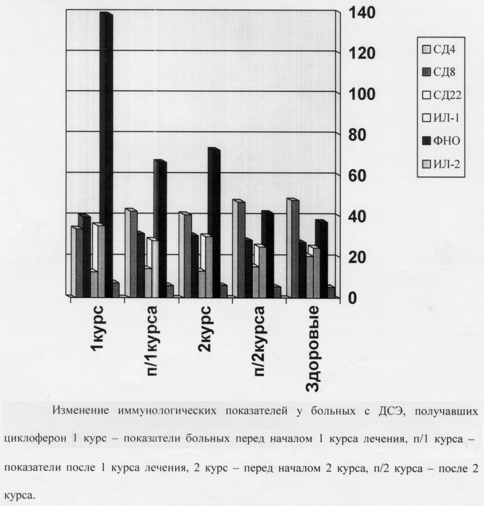 Полученные результаты стали основанием для применения у больных с ДСЭ циклоферона, обладающего иммунокорригирующим воздействием. После применения Ц у больных с ДСЭ наблюдалось увеличение хелперной активности лимфоцитов и, в то же время, снижение супрессорного клеточного потенциала, что обусловило нормализацию иммунорегуляторного индекса. Показано положительное влияние Ц на В-клеточное звено иммунитета. Важным представляется факт повышения иммунобиологической резистентности организма и достоверное улучшение показателей цитокинового статуса больных.