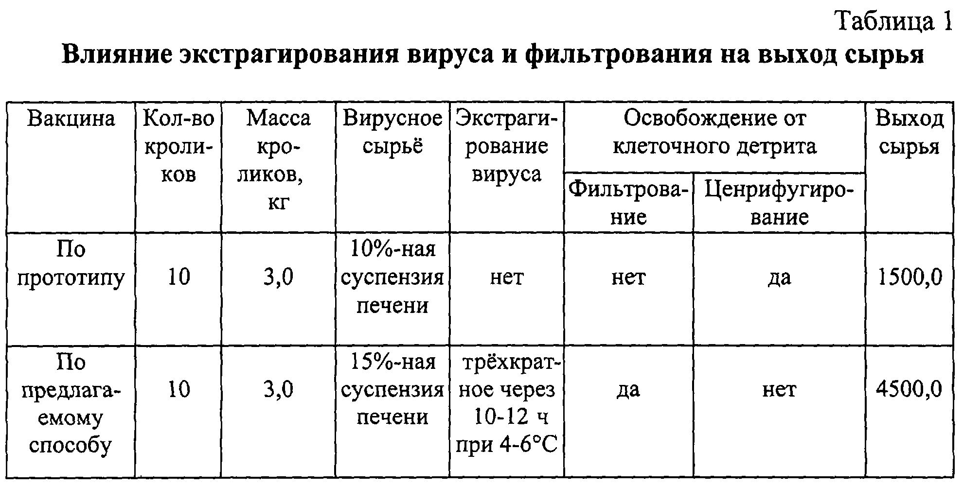 Использование трехкратного экстрагирования вируса и фильтрование через два слоя марлевого фильтра позволяет увеличить выход вирусного сырья в 2-3 раза при изготовлении вакцины по предлагаемому способу в сравнении с прототипом (таблица 1).