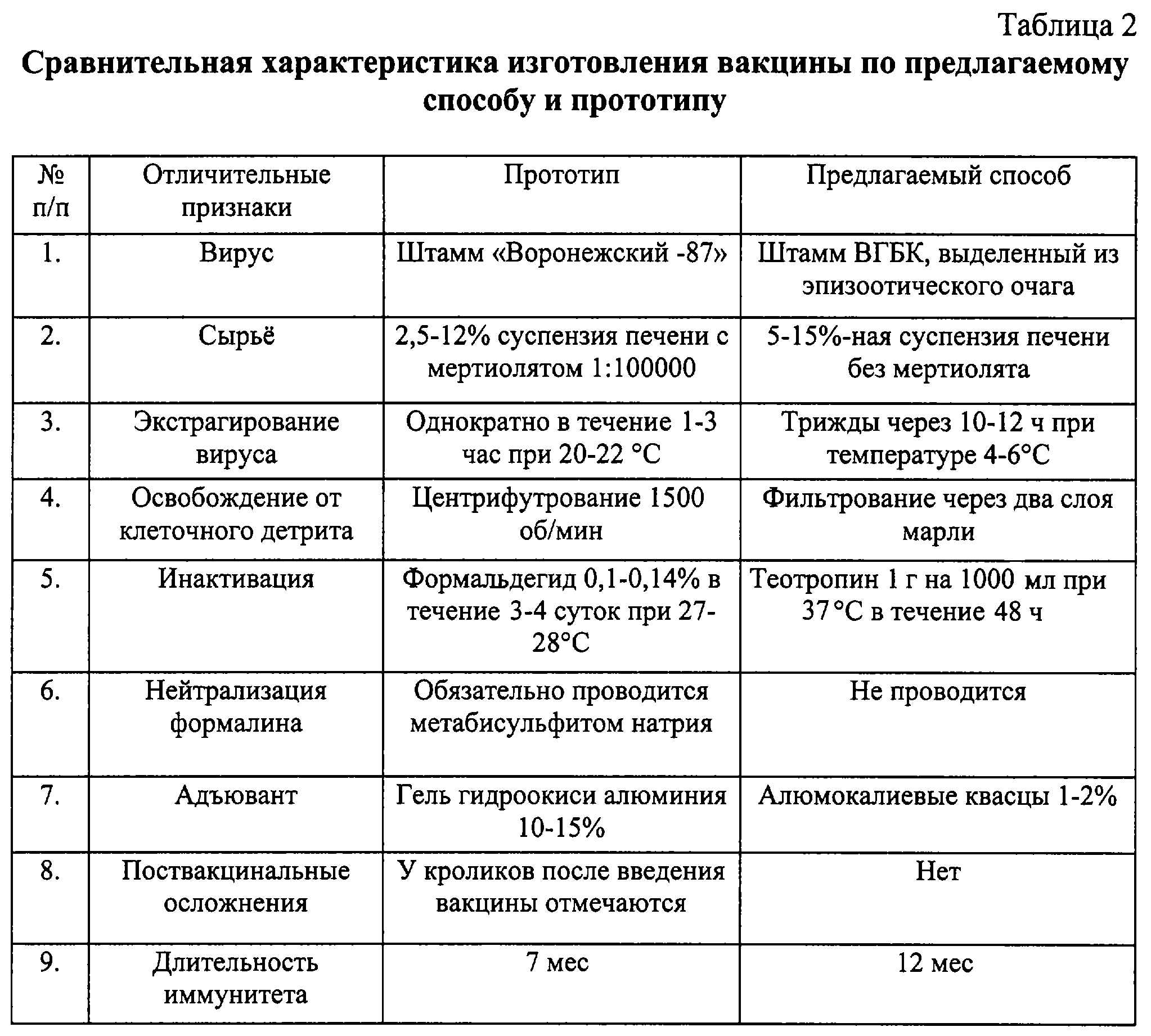Результаты по сравнительной характеристике вакцин против вирусной геморрагической болезни кроликов по предлагаемому способу и прототипу представлены в таблице 2.