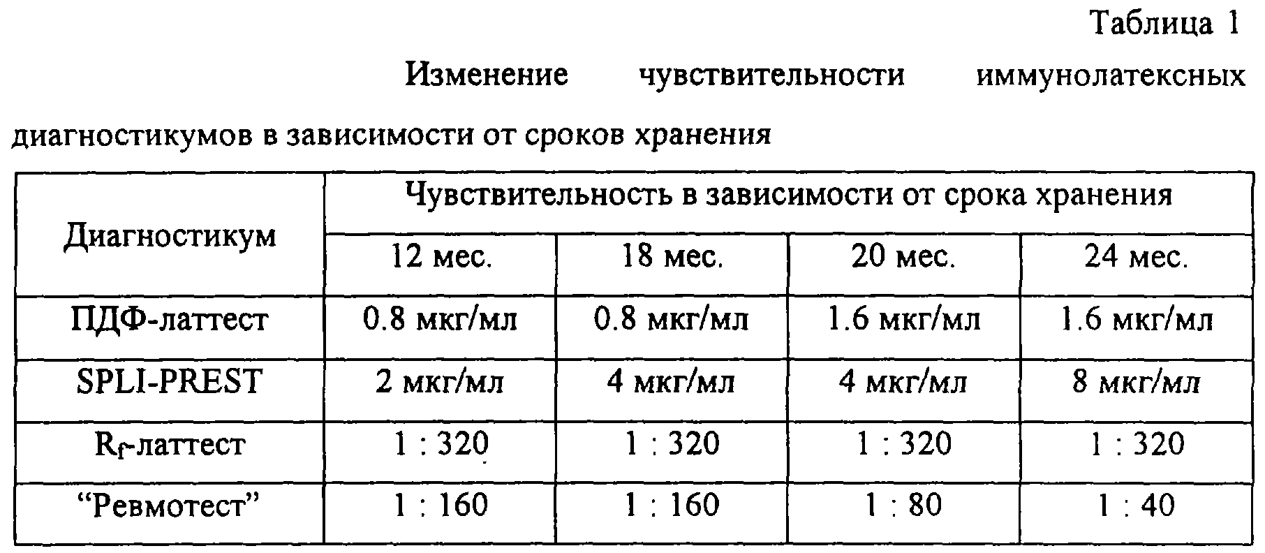Таким образом, предложенный иммунодиагностикум на основе модифицированного полистирольного латекса, содержащий в качестве балластного белка -казеин коровьего молока, характеризуется пролонгированным сроком годности и высокой чувствительностью, позволяющей проводить определения в разбавленных пробах, что препятствует возникновению неспецифической агглютинации и обеспечивает получение достоверных результатов.