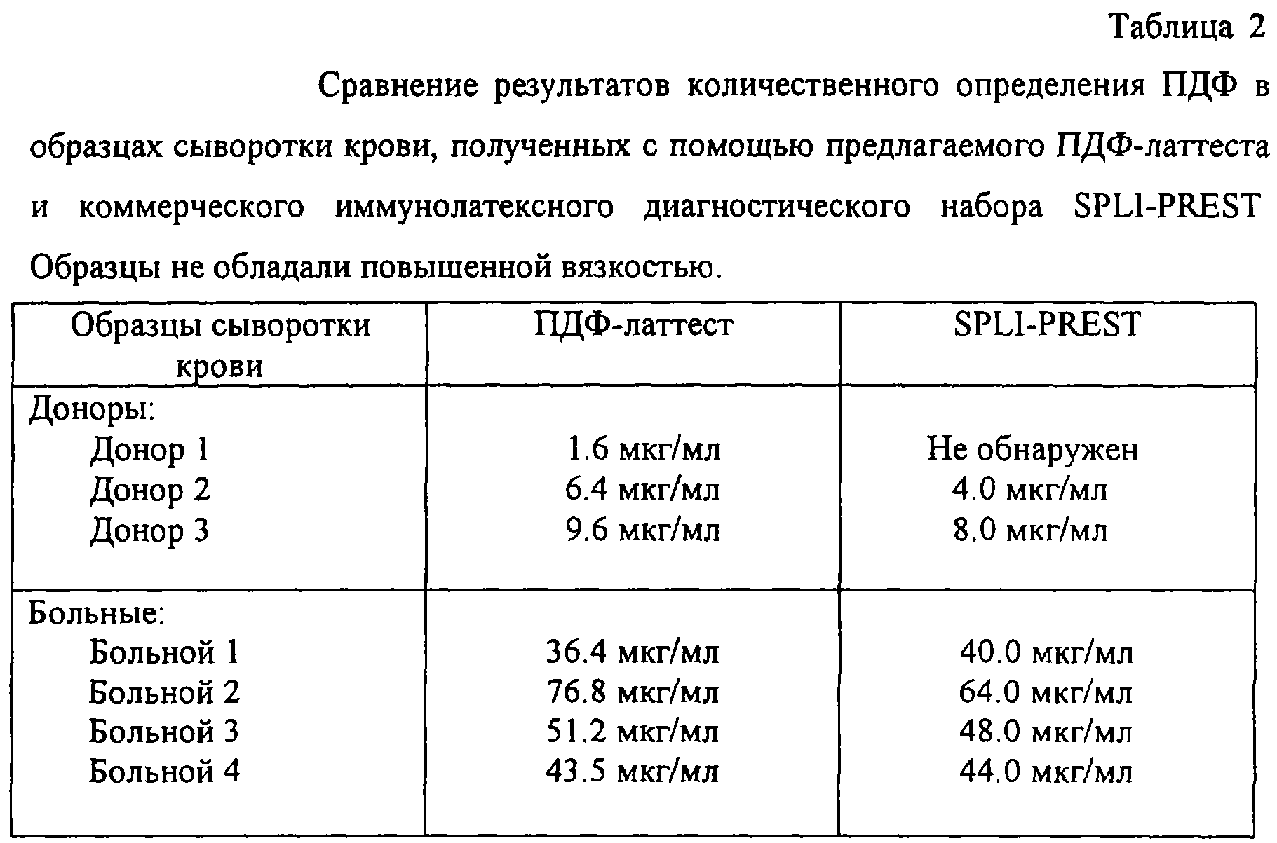 Описанным способом проведено определение ПДФ в образцах сыворотки крови трех здоровых доноров и четверых больных людей с диагнозом инсульт. ДВС-синдром был верифицирован у всех больных по известным клиническим и лабораторным критериям. Образцы крови данной группы больных не обладали повышенной вязкостью, провоцирующей неспецифическую агглютинацию. Полученные результаты представлены в табл. 2.