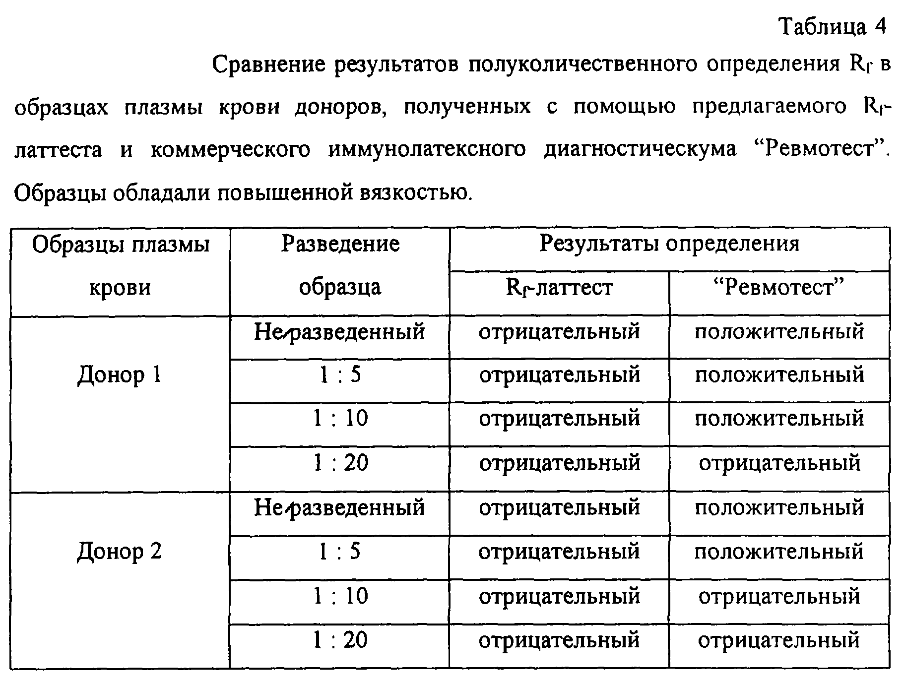 Представленные в табл. 4 результаты показывают, что при наличии в плазме крови компонентов, вызывающих неспецифическую агглютинацию (липидов, криоглобулинов, циркулирущих иммунных комплексов), в неразведенных образцах и в образцах со степенью разведения 1:5-1:10 использование “Ревмотеста” приводит к получению ложноположительного результата. При более высоком разведении отрицательный результат связан с недостаточной чувствительностью диагностикума. Предлагаемый Rf-латтест во всех случаях обеспечивает достоверный отрицательный результат.