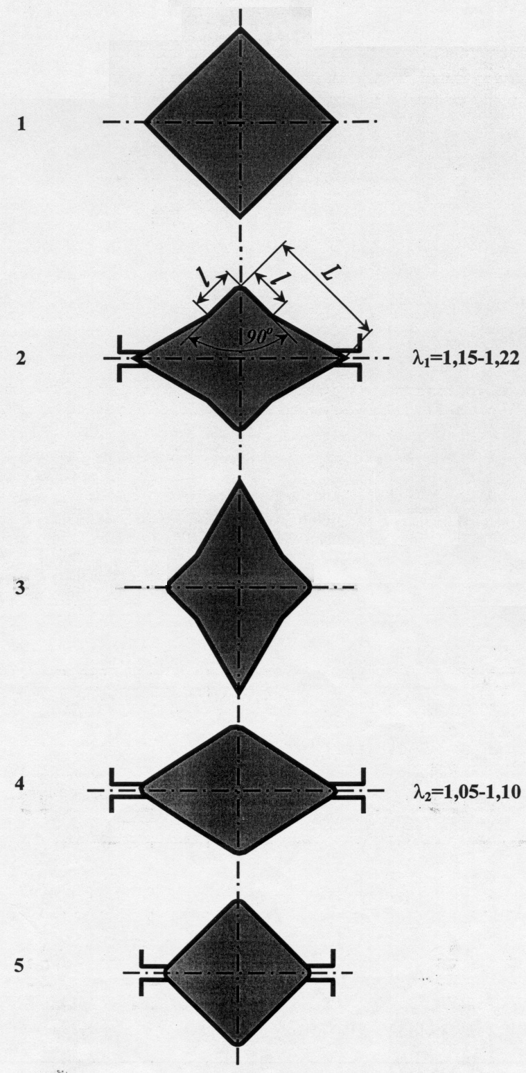 В процессе задачи непрерывно-литой заготовки с профилем 1 квадратного сечения в первый ромбический калибр, ее боковые поверхности в угловых зонах вступают во фрикционный контакт со взаимно перпендикулярными боковыми сторонами длиной l верхнего и нижнего валков. Площадь контакта непрерывно-литой заготовки с валками при захвате возрастает, благодаря чему достигается улучшение захвата. В результате обжатия с коэффициентом вытяжки 1=l,14-l,22 в первом проходе неблагоприятная литая структура заготовки в направлении меньшей ее диагонали разрушена, а ромбическая форма заготовки искажена (профиль 2). Но после кантовки на 90 (профиль 3) и обжатия заготовки во втором проходе в ромбическом калибре с коэффициентом вытяжки 2=1,05-1,10 достигается разрушение литой структуры в направлении ее второй диагонали, заготовка приобретает правильную ромбическую форму сечения (профиль 4). Кроме того, после второго прохода в ромбическом калибре все углы заготовки катаные скругленные, поэтому последующая ее задача в валки и деформирование в квадрат (профиль 5) затруднений не вызывает.