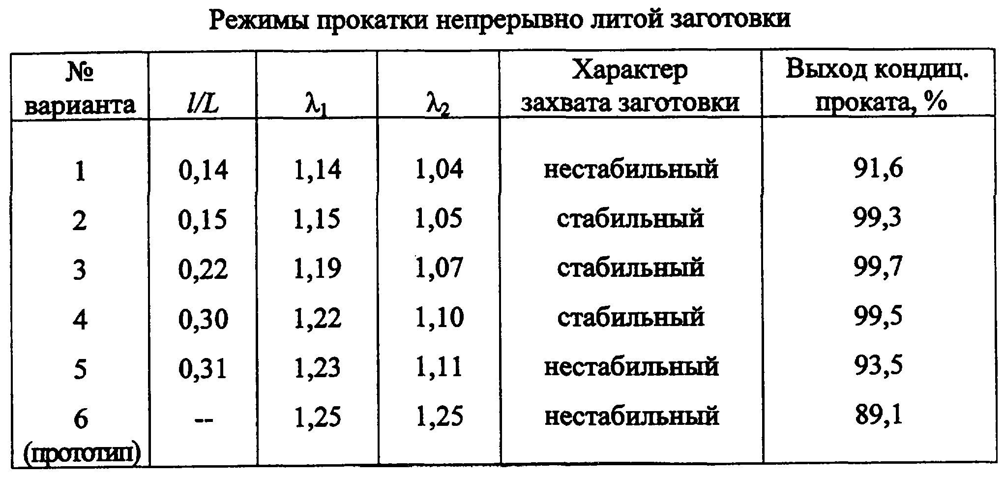 Из таблицы следует, что при реализации предложенного способа (варианты №2-4) достигается улучшение условий захвата непрерывно-литой заготовки валками. Благодаря этому стабилизируется темп и температурный режим прокатки, выход кондиционного проката максимален.