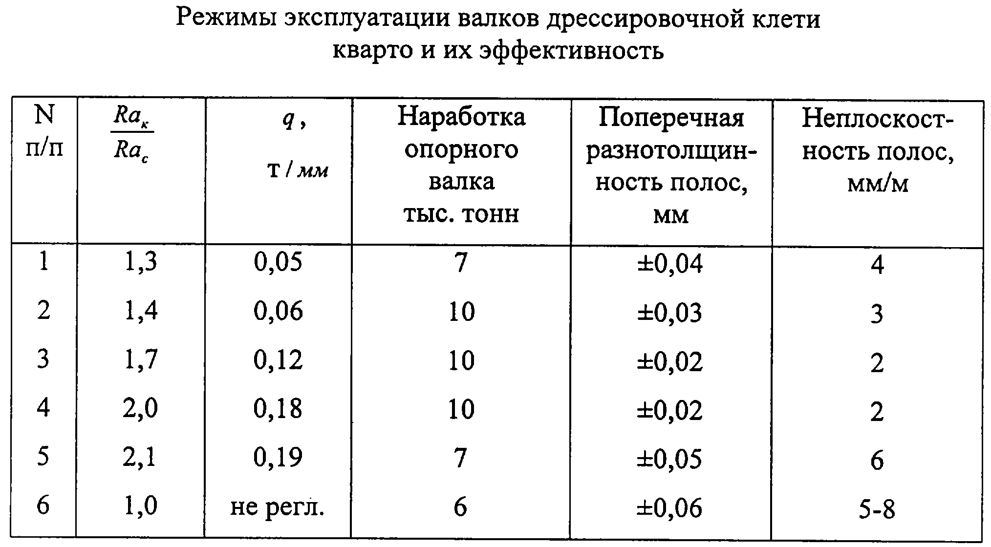 Варианты реализации способа эксплуатации валков дрессировочной клети кварто и показатели их эффективности представлены в таблице. Из табл. следует, что при реализации предложенного способа (варианты 2-4) достигается повышение стойкости опорных валков и качества дрессируемых полос. В случаях запредельных значений заявленных параметров (варианты 1 и 5) стойкость опорных валков и качество полос снижаются. Также более низкие показатели стойкости опорных валков и качества дрессированных полос имеют место при реализации способа-прототипа (вариант 6).