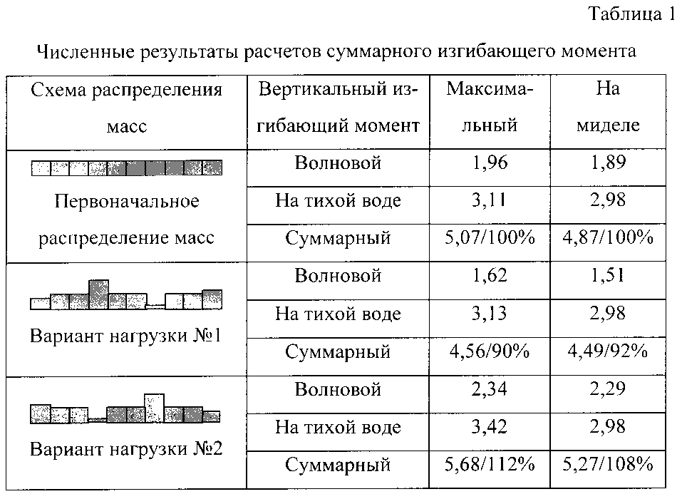 Предлагаемый способ размещения грузов на судне делает возможным уменьшить величину волнового изгибающего момента. При этом он не влияет на посадку судна и на параметры продольной качки. Поэтому остаются неизменными величины изгибающего момента в миделевом сечении на тихой воде (табл. 1) и ударного момента.