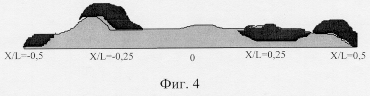 Эпюра дополнительного волнового изгибающего момента (на который уменьшается суммарный изгибающий момент) при оптимальном распределении масс имеет вид трапеции (фиг.3), и в районе между x/L=±0,25 поправка к изгибающему моменту постоянная.