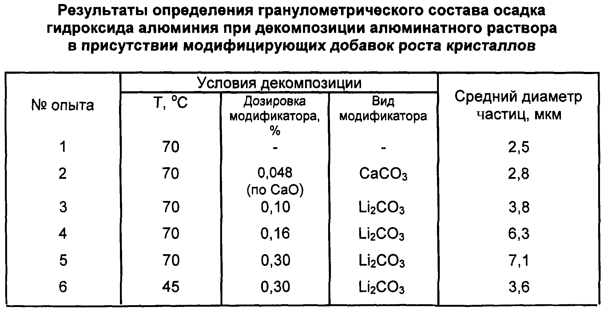 При декомпозиции алюминатного раствора с добавкой Li2СО3 (примеры 4 и 5) укрупнение тонких кристаллов по среднему диаметру составляло 6-7 мкм, что более чем в 2 раза выше, чем в присутствии CaO.