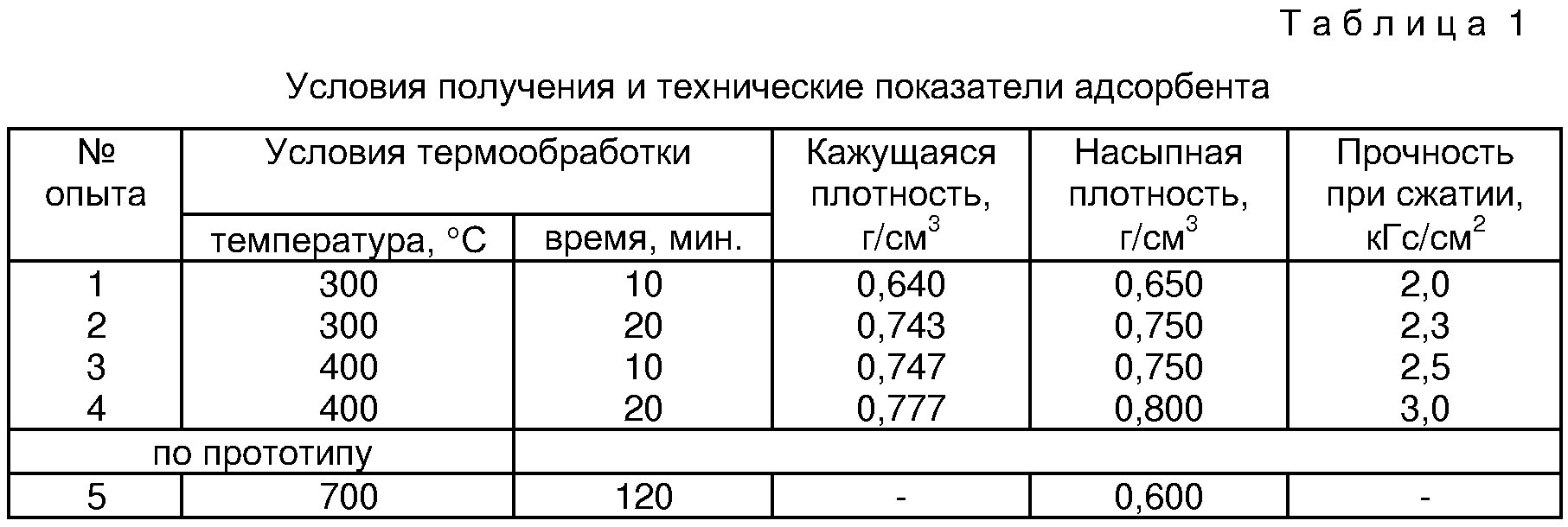 При повышении температуры свыше 400 С происходит оплавление гранул и снижение их адсорбционной способности. При температуре ниже 300 С прочность гранул недостаточна для их транспортировки. Термообработка менее 10 мин недостаточна для прогрева гранул 5-20 мм до температуры 300-400 С, а увеличение времени свыше 20 мин экономически нецелесообразно.