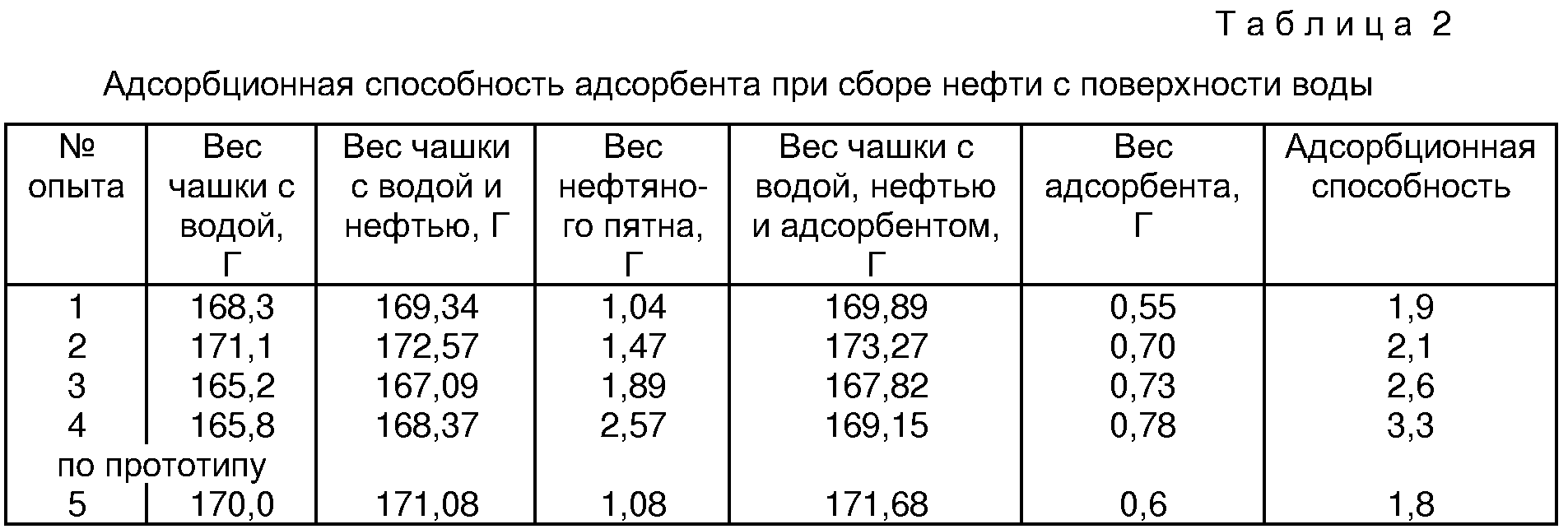 Из табл. 2 видно, что предлагаемый адсорбент позволяет удалить с поверхности воды нефть, в количестве в 1,9-3,3 раз превышающем его вес, по прототипу – в 1,8 раз.
