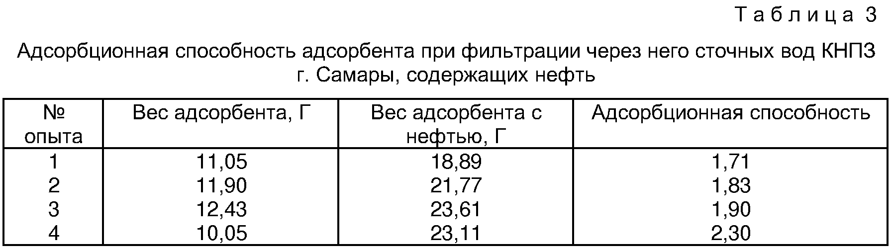 Данные по определению адсорбционной способности полученного по примеру 1 адсорбента при фильтрации через него стоков, содержащих нефть, приведены в табл. 3.