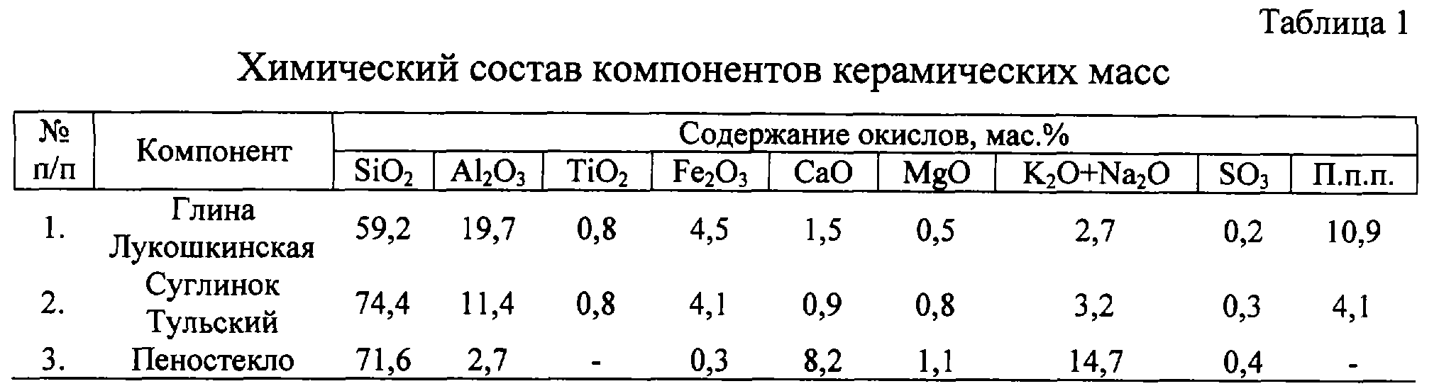 Пример 1. Взвесили предварительно высушенную измельченную и просеянную через сито с размером отверстий 1 мм Лукошкинскую глину в количестве 6,0 кг (табл. 2, смесь 1), к этой глине добавили 4,0 кг дробленного пеностекла, просеянного через сито с размером диаметра ячеек 2,5 мм и оставшегося на сите 0,1 мм.