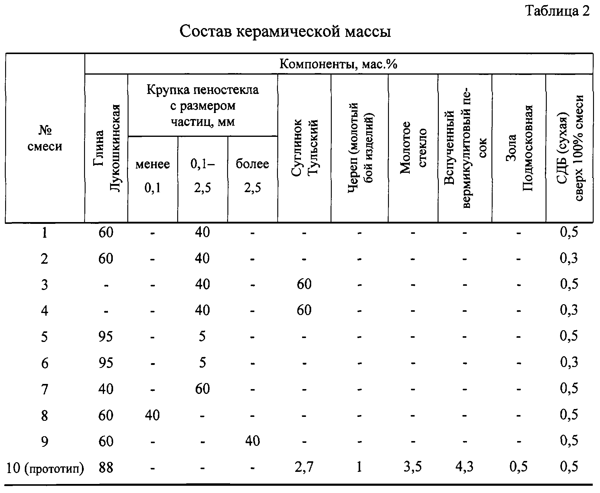 В производственных условиях состав керамической массы в виде пресс-порошка готовят известным способом. Например, дозируют тонкоизмельченное сухое глинистое сырье, просеянное через сито с диаметром ячейки не более 1 мм, добавляют крупку пеностекла в соотношении по сухой массе, указанной в табл. 2. Смесь сухих компонентов увлажняют 5% раствором СДБ до влажности 6…10%, аналогично с [2], перемешивают до однородного состояния. Смесь формируют методом полусухого прессования под давлением.