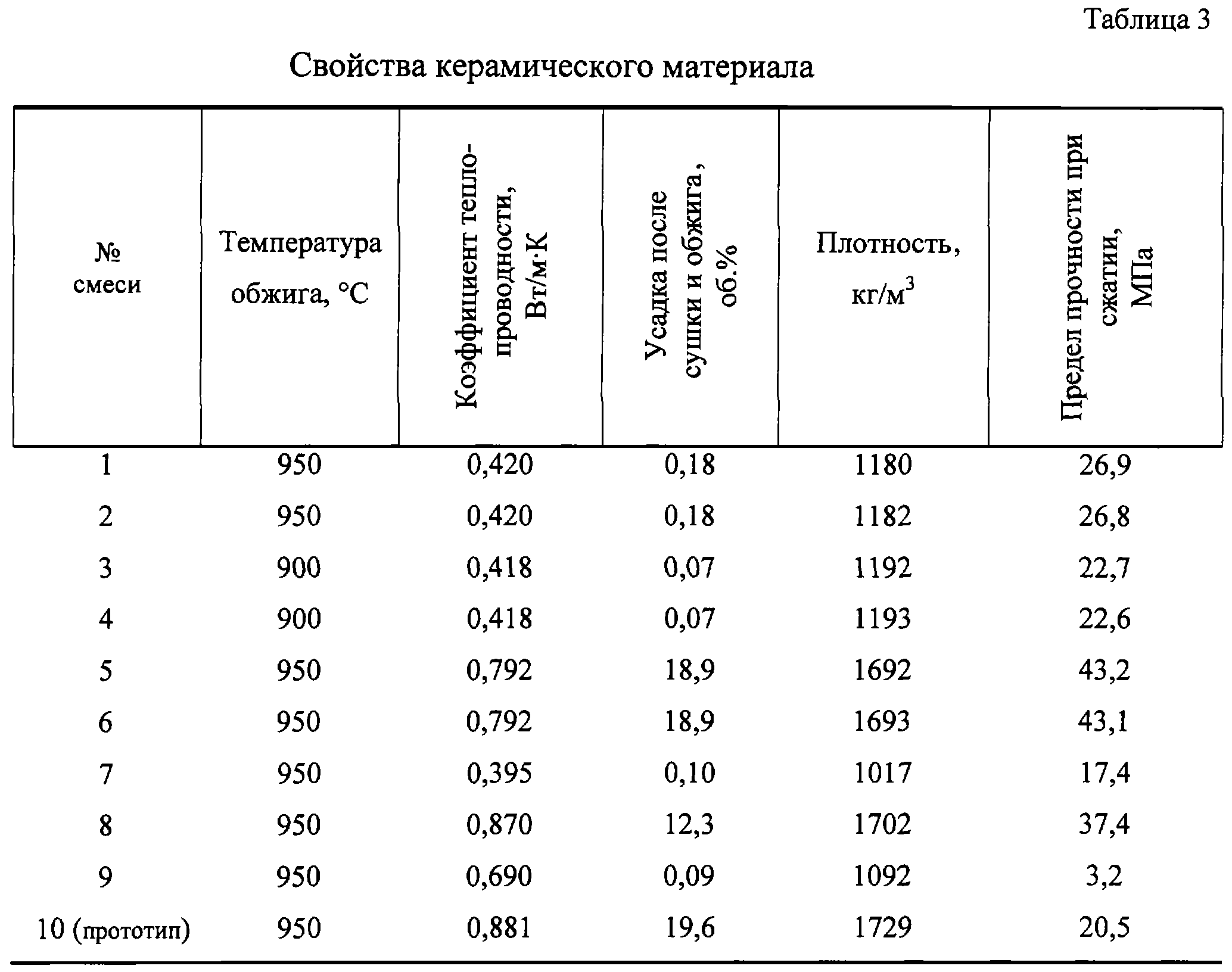 Наряду с указанными достоинствами имеются и существенные недостатки. Недостатками прототипа являются высокий коэффициент теплопроводности, большая усадка при сушке и обжиге, повышенная плотность получаемых стеновых керамических изделий.