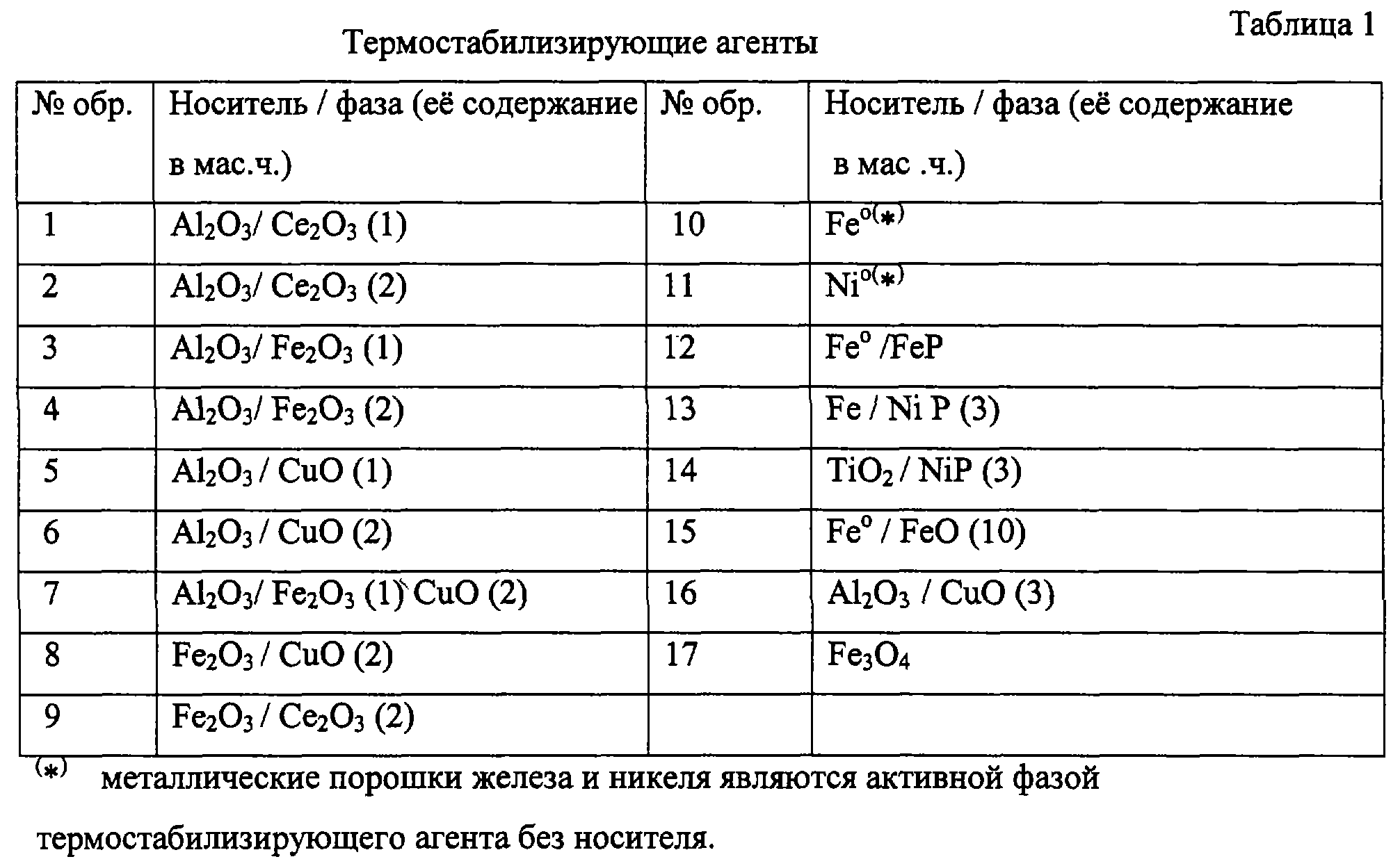 и дополнительно введен термостабилизирующий агент – фосфиды железа, никеля, оксиды железа, меди, церия или их смесь, нанесенные в виде активной фазы на металлы или оксиды металлов, выбранных из группы алюминия, железа и титана, 3-10,6 мас.ч.