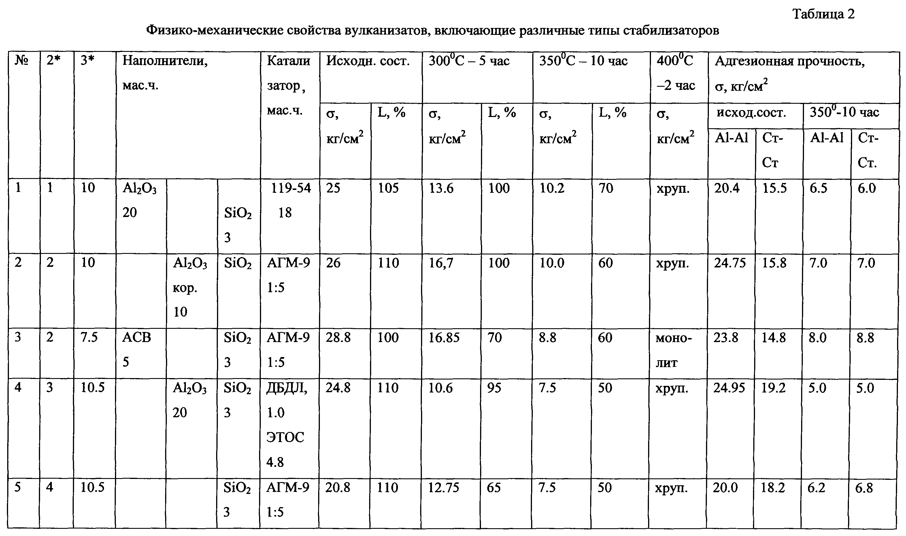 По данным физико-механических характеристик вулканизаты до старения имеют низкие значения прочностных характеристик ( =14-17 кг/см2, L=150%, после старения в вакууме при 300 С =5-6 кг/см2, L=80-120%) даже при использовании блоксополимера (Б). В данном изобретении все композиции были использованы в качестве клеев для резин. Результаты испытаний материалов на разрыв показали разрушение резин при температуре 300 С. Иначе говоря, полученные материалы не выдерживают высоких температур, что является серьезньм недостатком предложенной композиции.