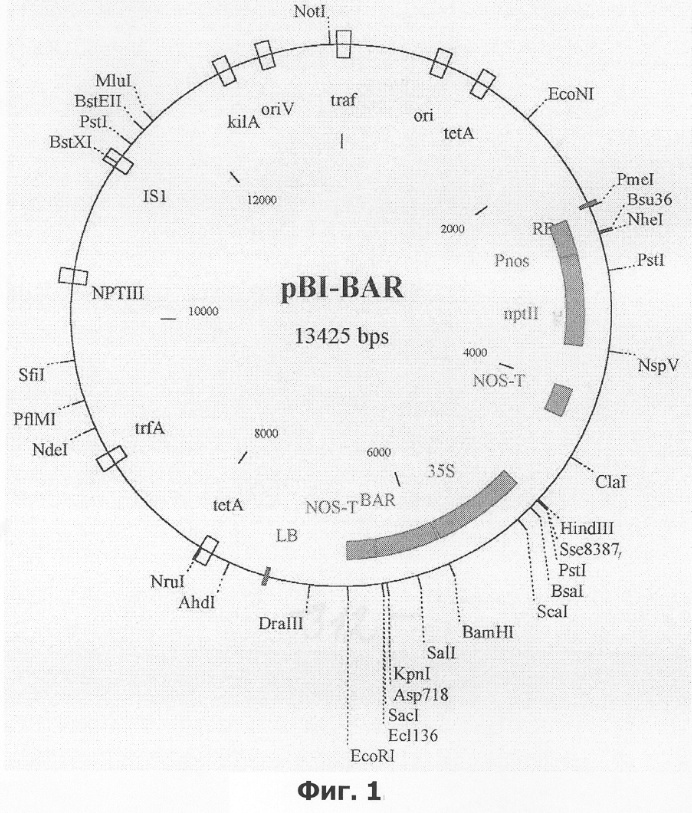 Для трансформации использовали штамм Agrobacterium tumefaciens СВЕ 121, содержащий плазмиду pBIBar (фиг.1), в состав кассеты экспрессии которой входят генетические конструкции: