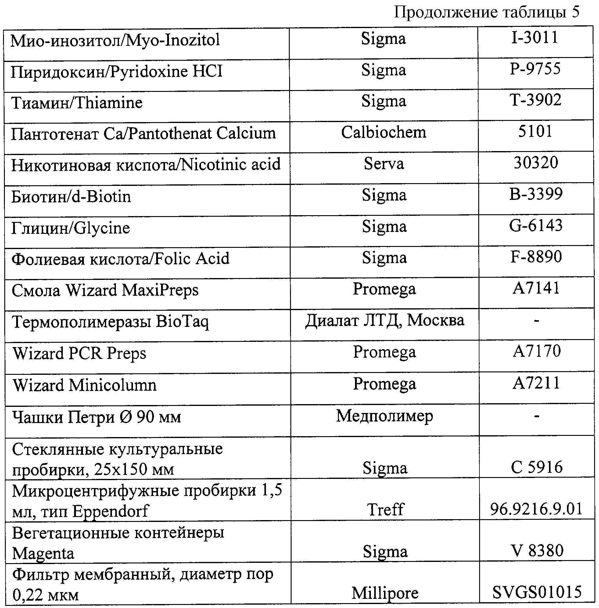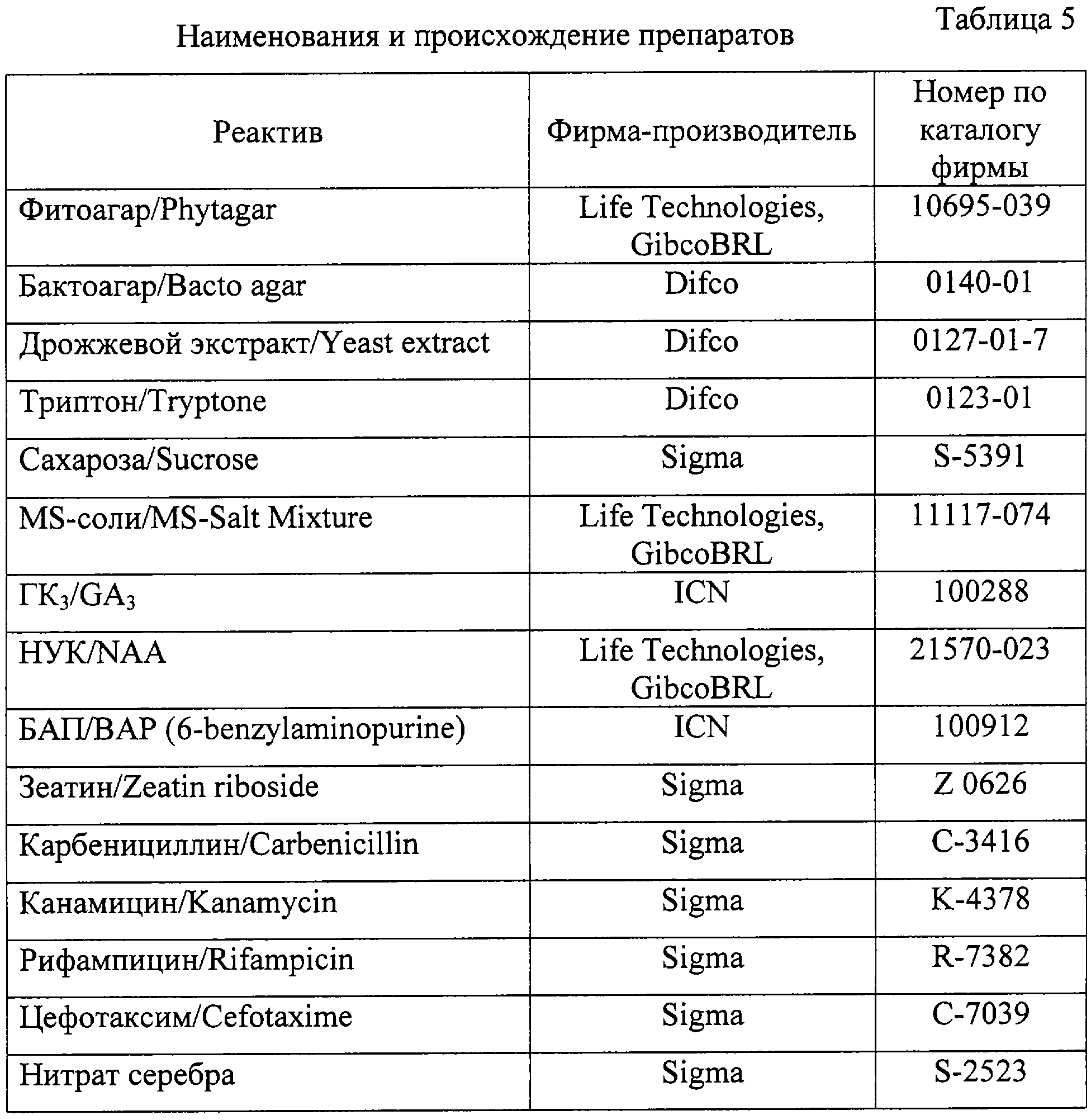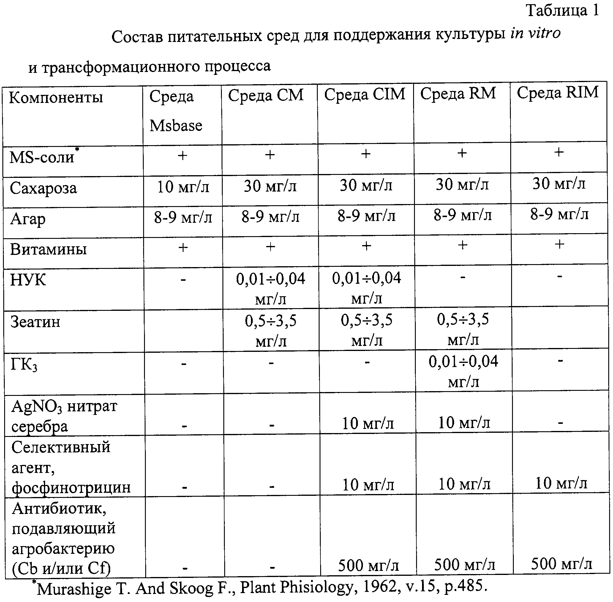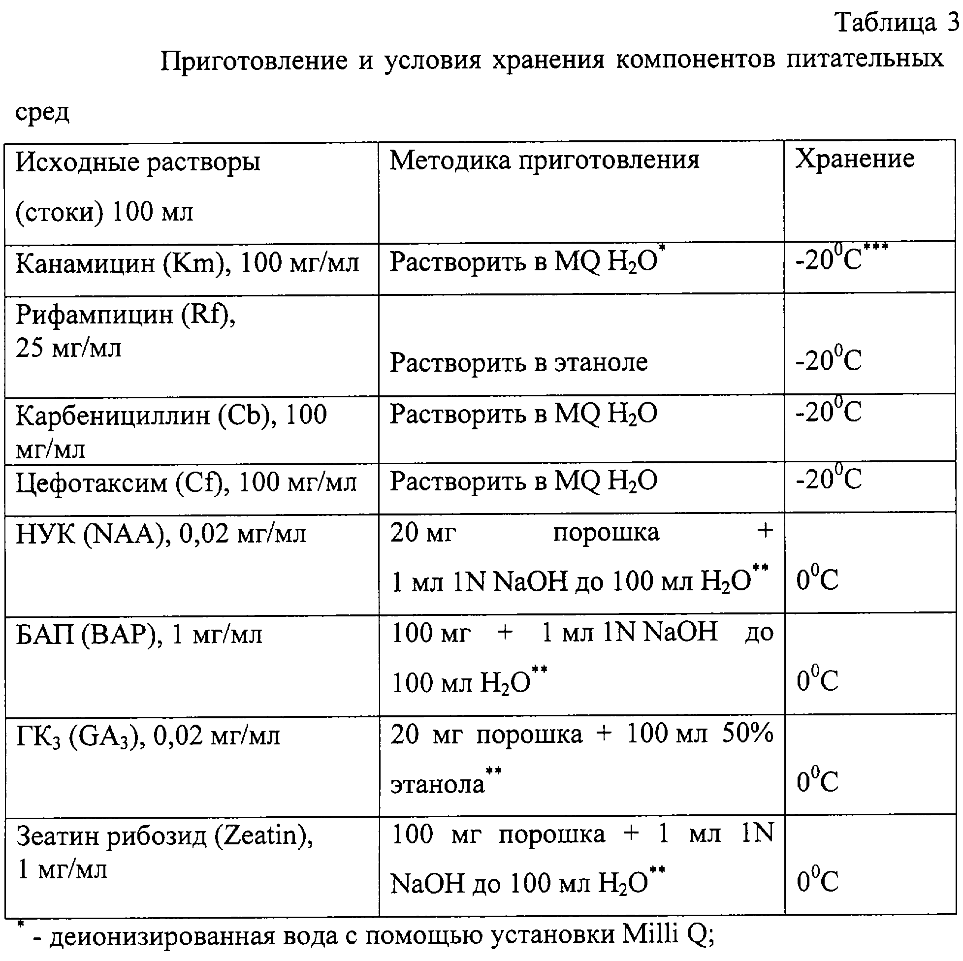 Для приготовления сред, представленных в табл.1, готовили раствор MS-солей в деионизованной воде, доводя рН до значения 5,6-5,8 0,1 с помощью растворов 1N КОН и 1N HCl. Стерилизацию сред осуществляли в автоклаве при 1 атм, 121 С в течение 20 мин. После охлаждения среды до +45-50 С добавляли витамины (табл.2), гормоны, антибиотики и селективные агенты (методика приготовления и концентрации стоков см. табл.3) соответственно составу сред и заливали чашки Петри ( 9 см) по 20 5 мл среды в каждую.